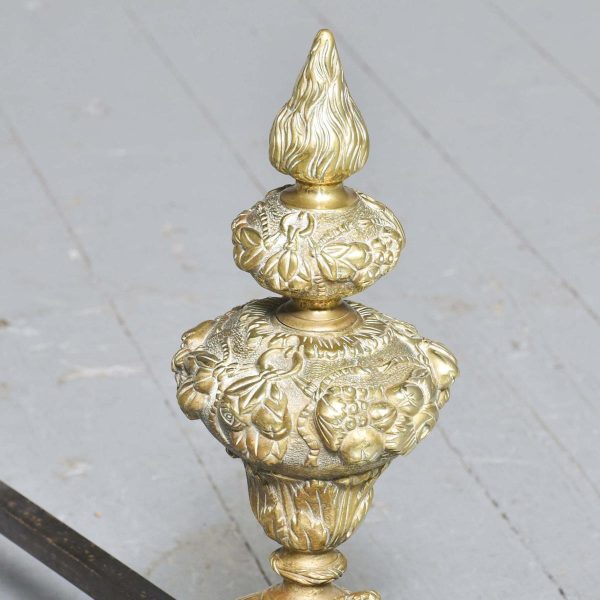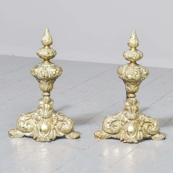Circa 1880. An impressive pair of cast brass fire dogs. Tops in the form of basket surmounted and oval shaped section and crowned with a cast brass finial of a flame to the base with two hairy paw feet left and right, and a cast cartouche in the centre all with foliate and rococo casting. To the back there is a cast iron leg which folds down to form of the back leg.