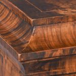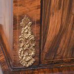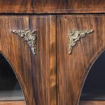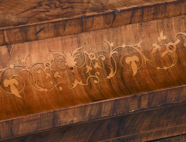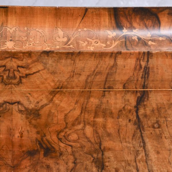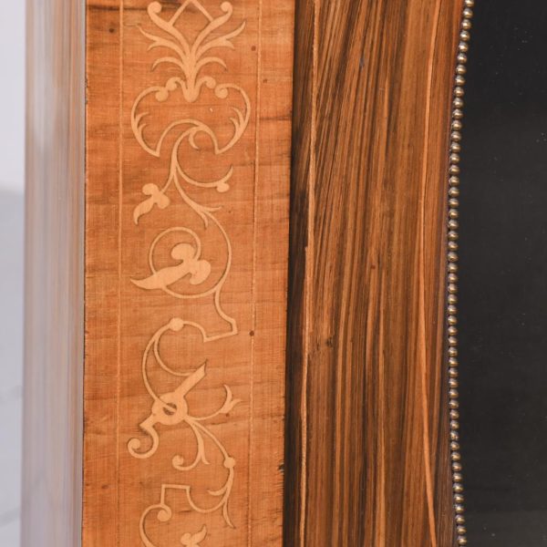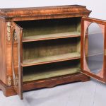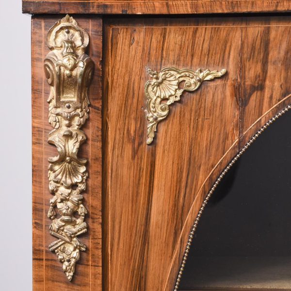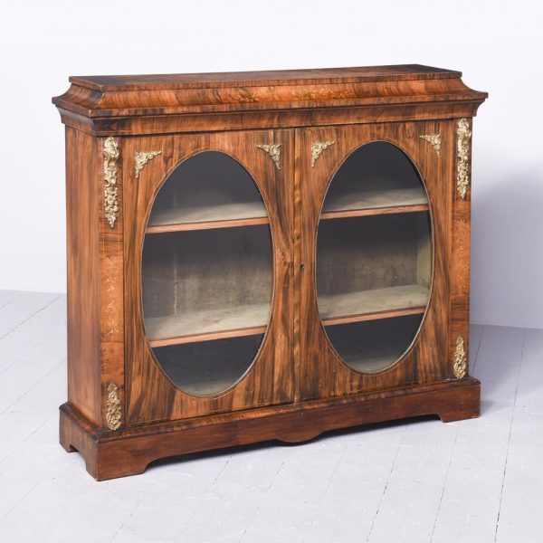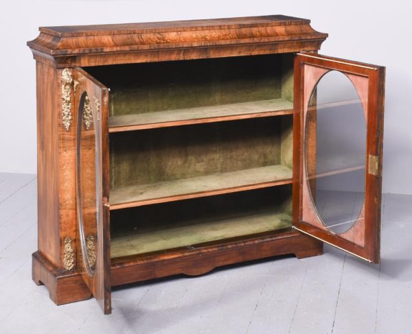Circa 1860. Victorian two door inlaid walnut credenza. The rectangular top with mirror matched figured walnut and boxwood inlay above a cavetto moulding with foliate inlay. The two doors with oval glazed panels with brass beading and brass mounts, open to a shelved interior and flanked by marquetry inlaid pilasters with foliate brass mounts. All supported on a moulded enclosed plinth base.