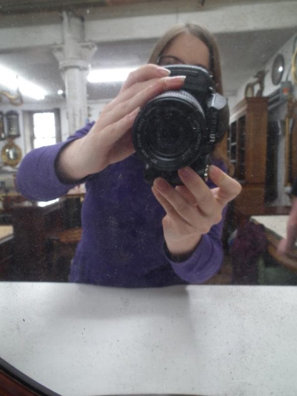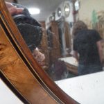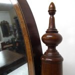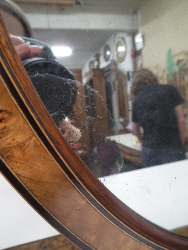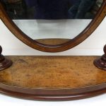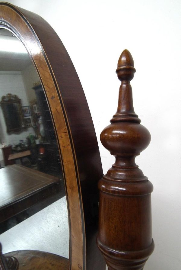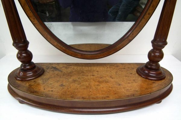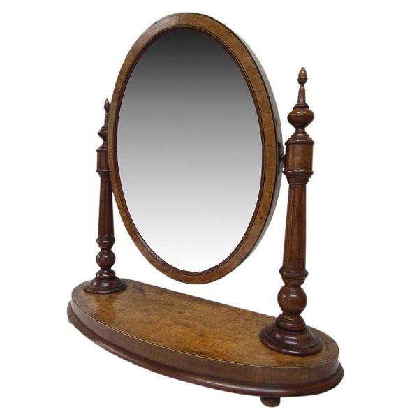Circa 1870, large Victorian burr elm oval toilet mirror, with a multiple inlaid frame, supported by two fluted and turned uprights, above a large oval platform base with half veneer and ebonised and boxwood inlay. All standing on small turned squat feet.