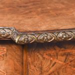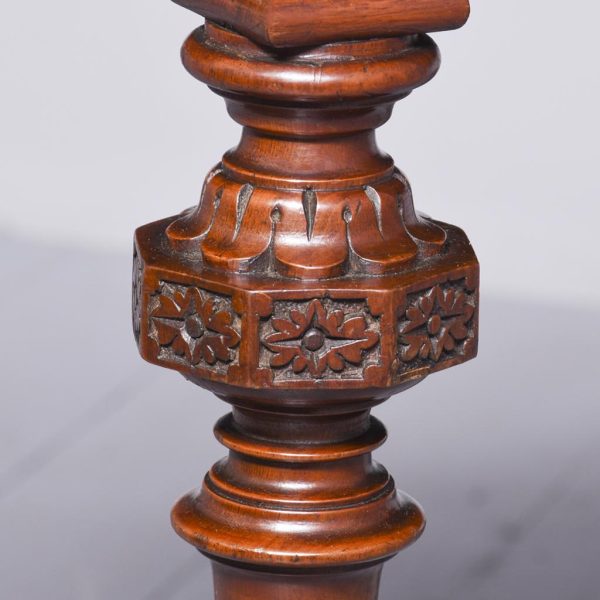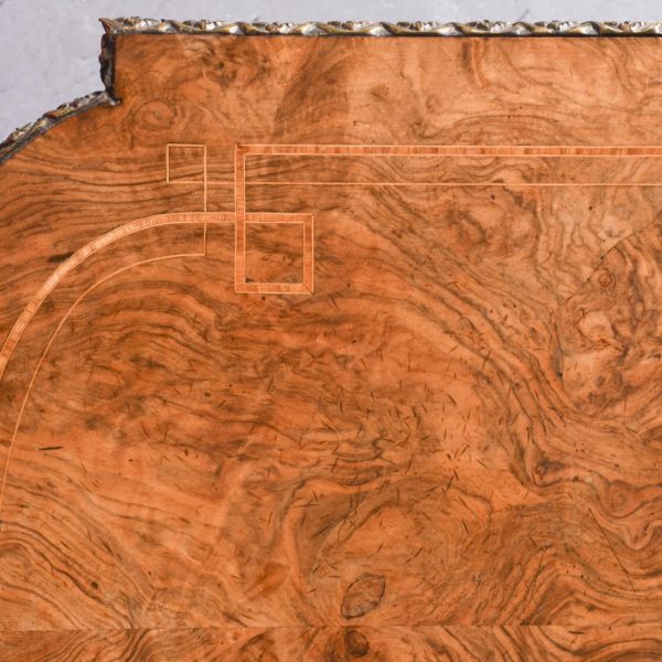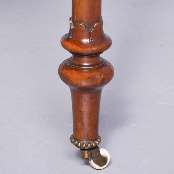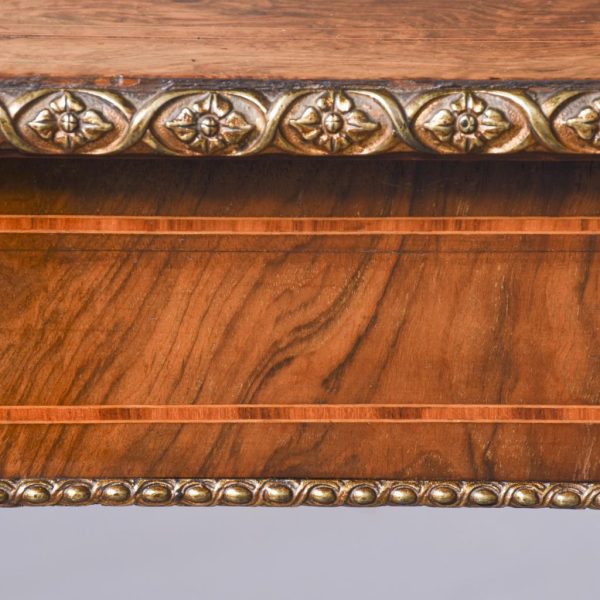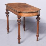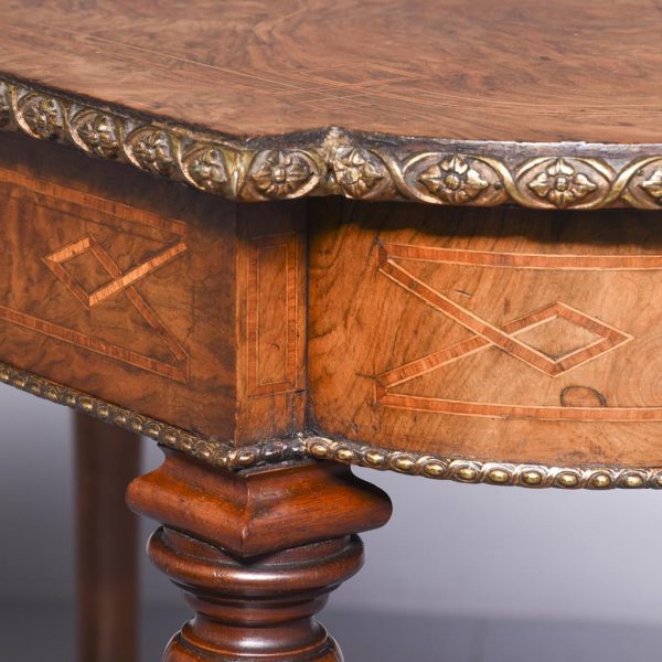 Circa 1860. Quality freestanding inlaid figured walnut Victorian centre or side table. The rectangular top with rounded ends and quartered, mirror-matched figured walnut panels surrounded by boxwood and tulip wood inlay. The fore-edges with foliate, cast brass mounts, above an inlaid frieze with further brass mouldings. All supported on carved octagonal above tapering, ring-turned feet with cast brass and white porcelain castors.