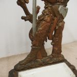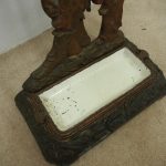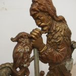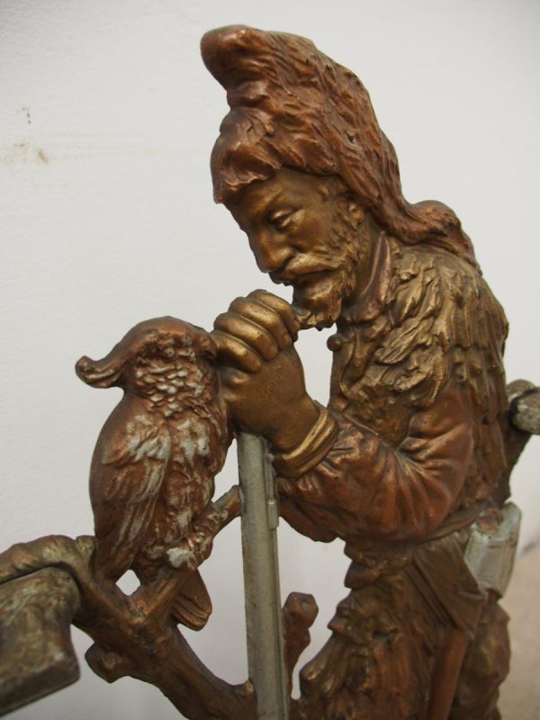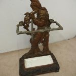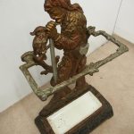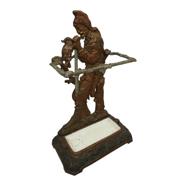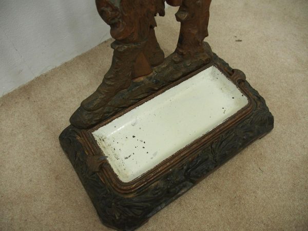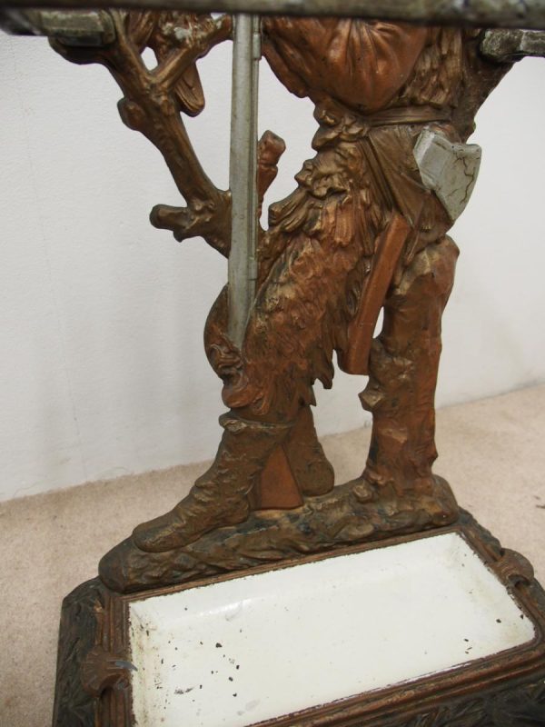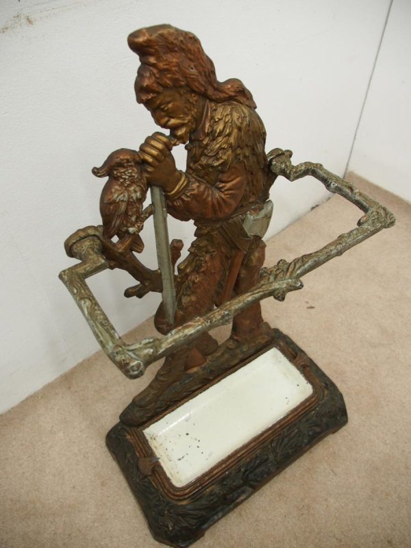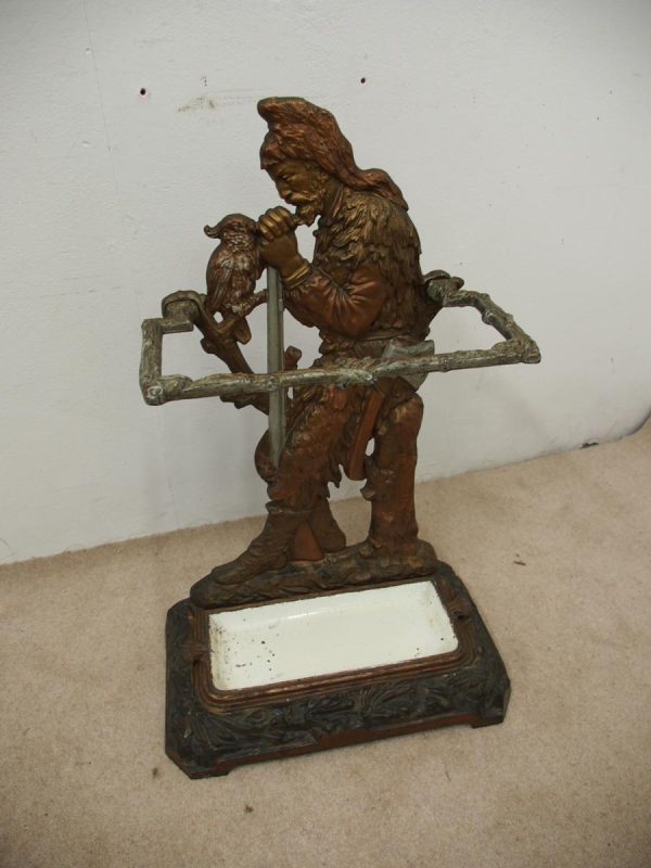 Circa 1880, unusual polychrome cast iron Victorian stick stand depicting Robinson Crusoe with a cockatoo. With a foliate style rail and standing on a foliate style base with removable drip tray, it has an impressed casting of “No 10 – 85728” on the underside.