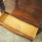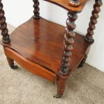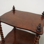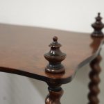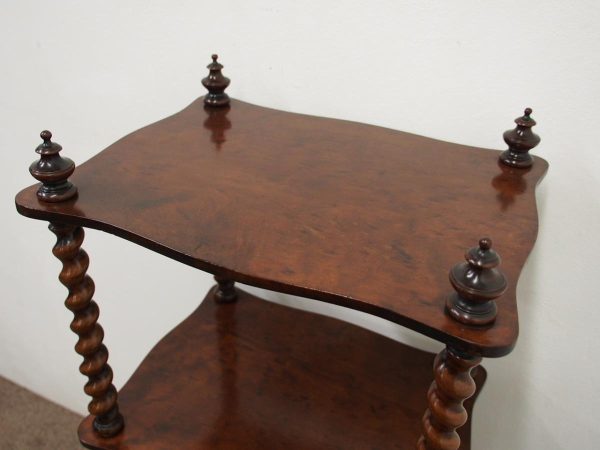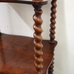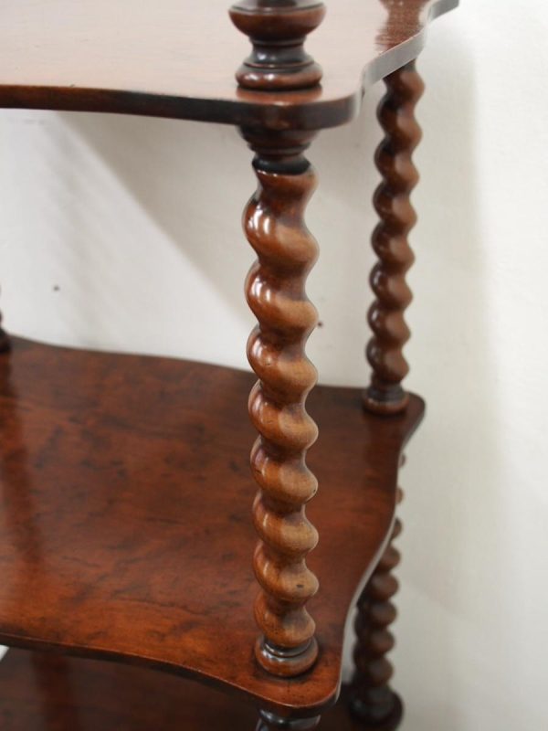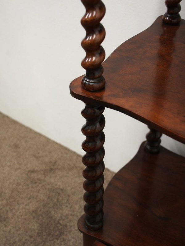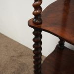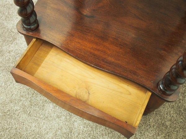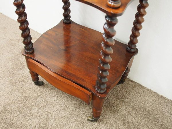 Circa 1860, Victorian three tier whatnot made of lovely figured “plum pudding” mahogany. The serpentine-sided tiers are supported on barley twist columns and surmounted by finials. There is a hidden shaped-front drawer to the base as well, finishing on castors.