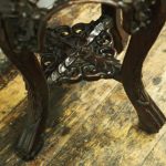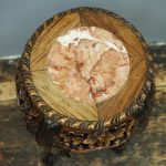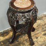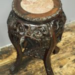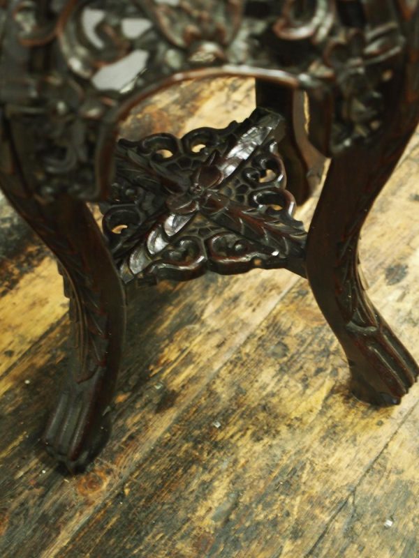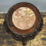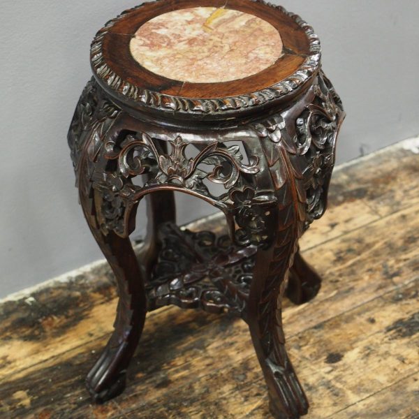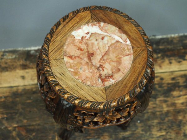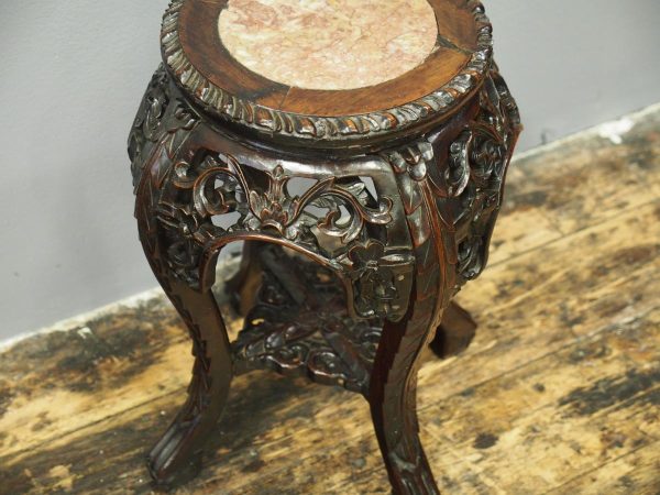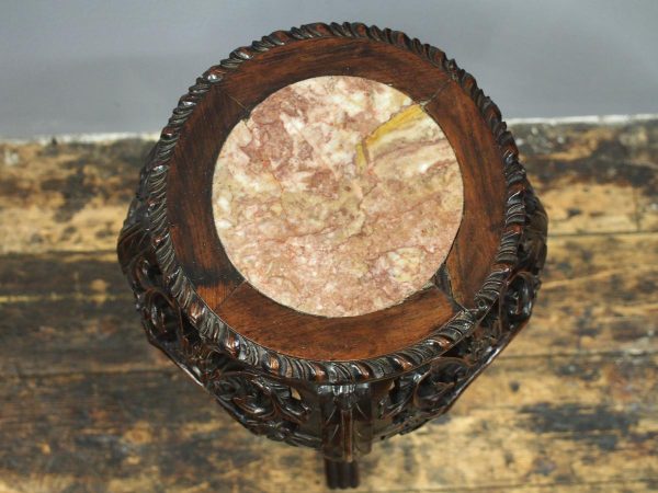 Circa 1890, Chinese rosewood Qing dynasty plant stand. With carved frame and pink mottled marble top, there is a gadrooned edge and a classic open fretwork apron. The legs are shaped with carved leaves on both sides, and it is supported by a shaped stretcher.