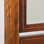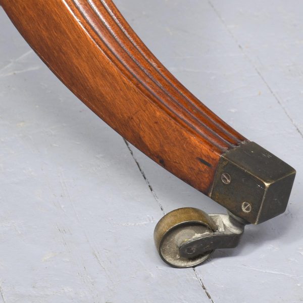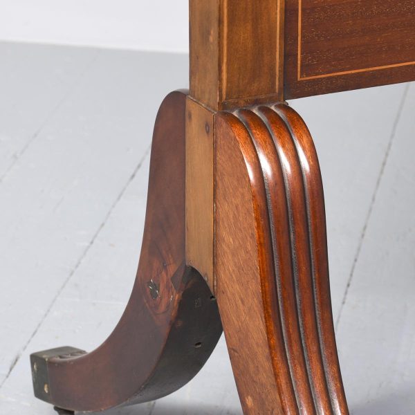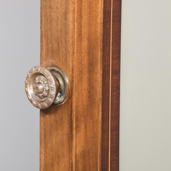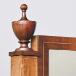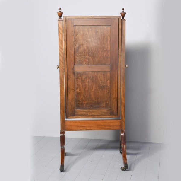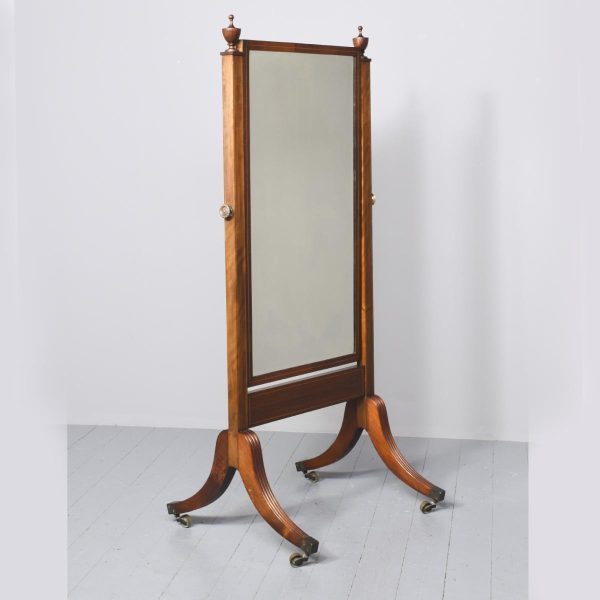 Circa 1880. Georgian style mahogany cheval mirror. The rectangular bevel edged mirror, with mirror plate in excellent condition within a boxwood inlaid frame between square uprights with finely turned finials with a stretcher beneath and supported on fluted trestle cabriole legs with brass caps and castors.