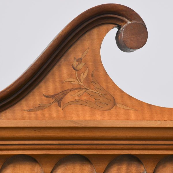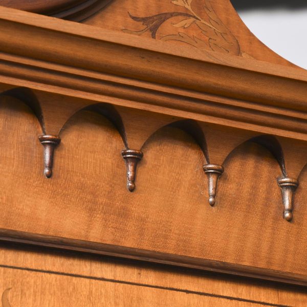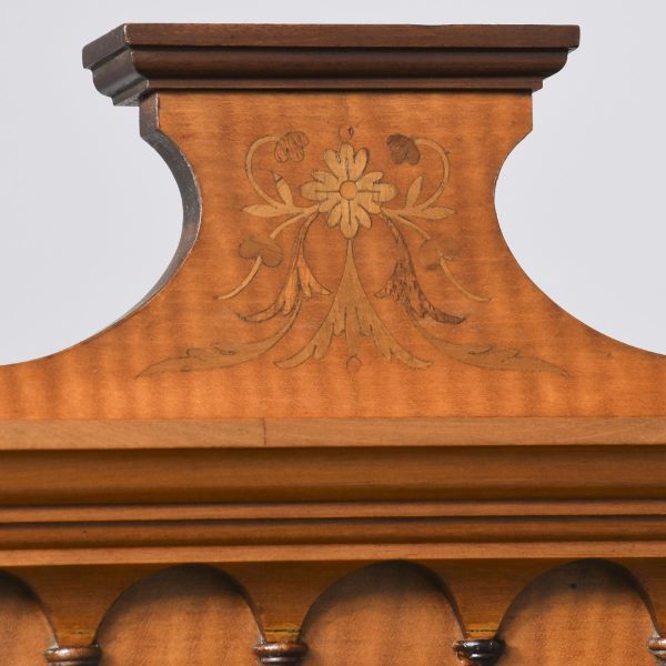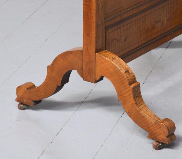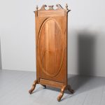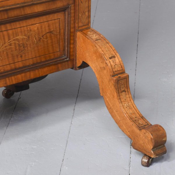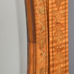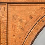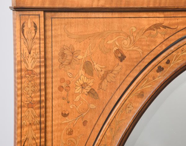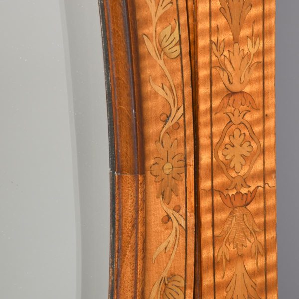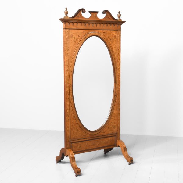Circa 1890. Magnificent 19th century marquetry inlaid satinwood cheval mirror. Surmounted by a moulded cornice with fluted finials between and arched pediment with marquetry foliate inlay in exotic woods. The mirror frame is ebony inlaid with multiple bands of marquetry inlay and the oval bevel-edged mirror is in perfect condition with further marquetry’s surrounding. The base with a further panel with urns and foliate inlaid decoration. All supported on marquetry inlaid cabriole legs with hidden brass casters. In exceptional condition.