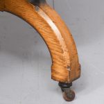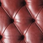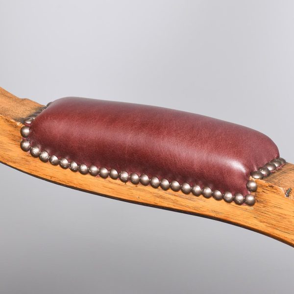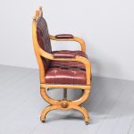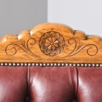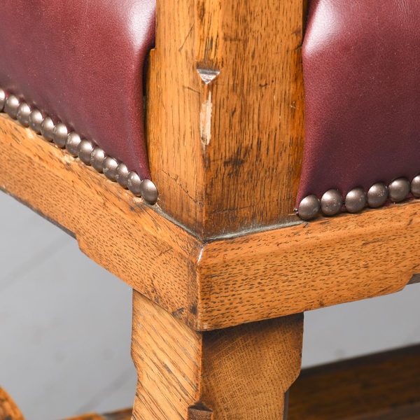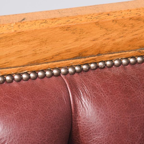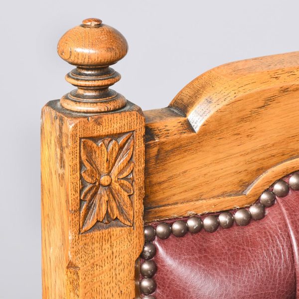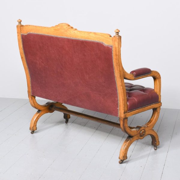 Circa 1890. A late Victorian oak framed two-seater sofa. The framed back, with top rail raised in the centre with a carved slower and scratch carving. The ends are surmounted by shaped finials with carved flowers beneath. The deep buttoned and pleated back, arms and seat in burgundy leather, recently (traditionally) re-upholstered, the leather held in place by closed brass nails. The curved and padded arms held in place by sturdy chamfered uprights. The sofa rests on two X frame ends united by a large chamfered stretcher, finishing with a proud rondel on each end, finishing on two downward facing legs with brown and porcelain castors beneath.