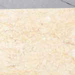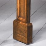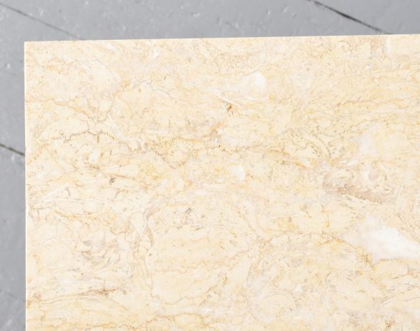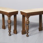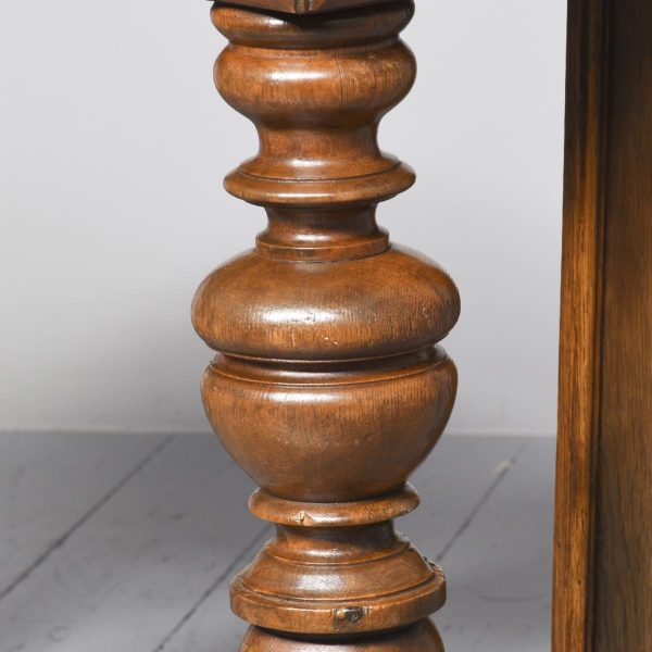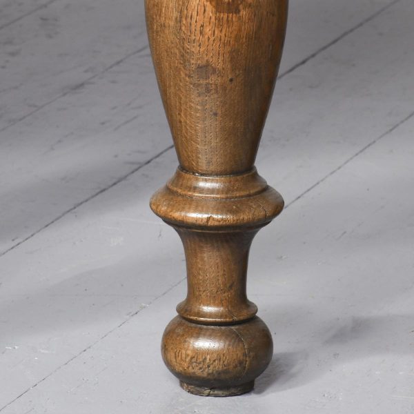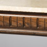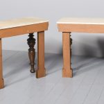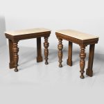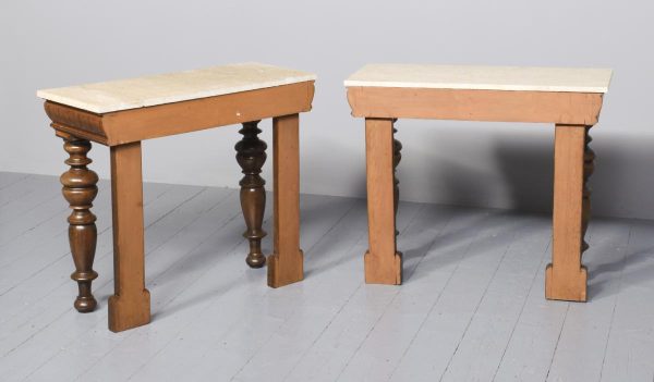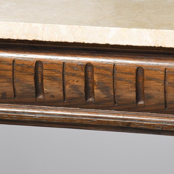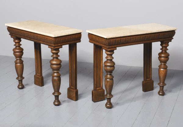 Circa 1880 and later. An unusual pair of marble top side tables. The rectangular tops in a pale beige variegated marble resting on a pair of oak bases (adapted), the shapely carved frieze to the front and sides, square back legs with paneled facings, front legs turned, bulbous, tapering, finishing on large bun feet.