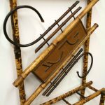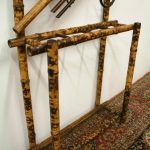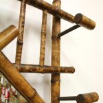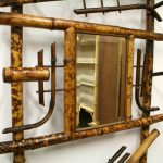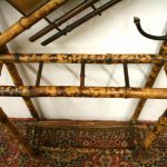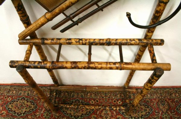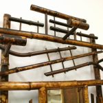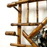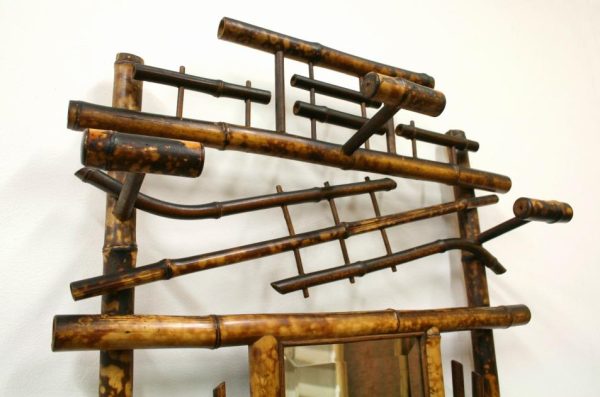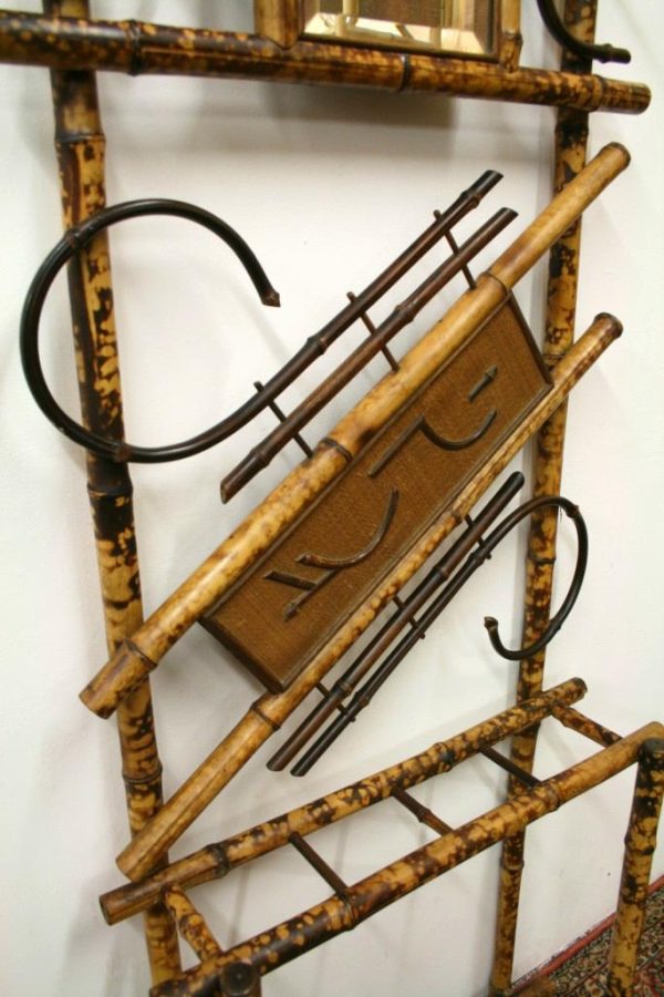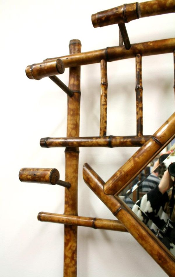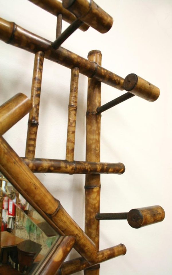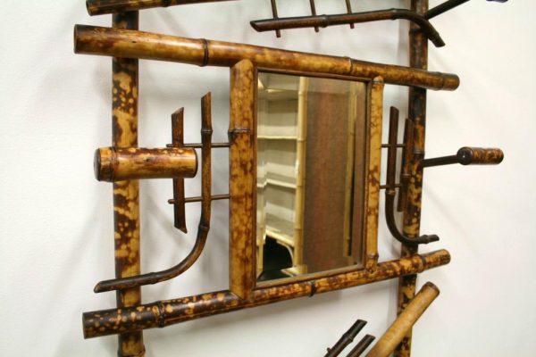 Circa 1880, unusual Chinese style bamboo hall stand, with a rectangular bevelled edge mirror in the centre and below this a rattan section. There are five hooks, almost in the form of hammer heads, and at the bottom is a stick stand with four divisions. Excellent condition, sturdy and very stylish.