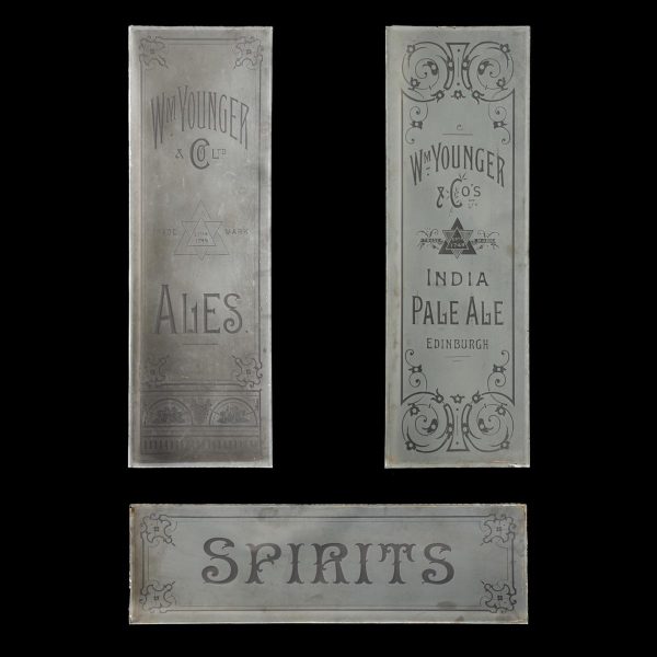 Circa 1900. A set of three frosted glass pub advertising plates. Consisting of a pair of tall narrow etched mirrors with’ W. Younger and Company Ltd, India Pale Ale, Edinburgh’. The frosted glass has stylish Victorian decoration and border. The smaller frosted glass has ‘Spirits’ etched onto it, stylish.