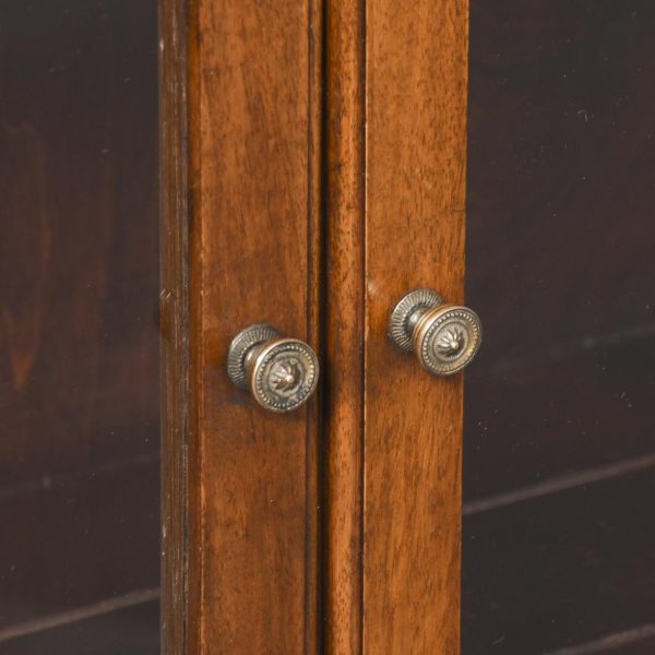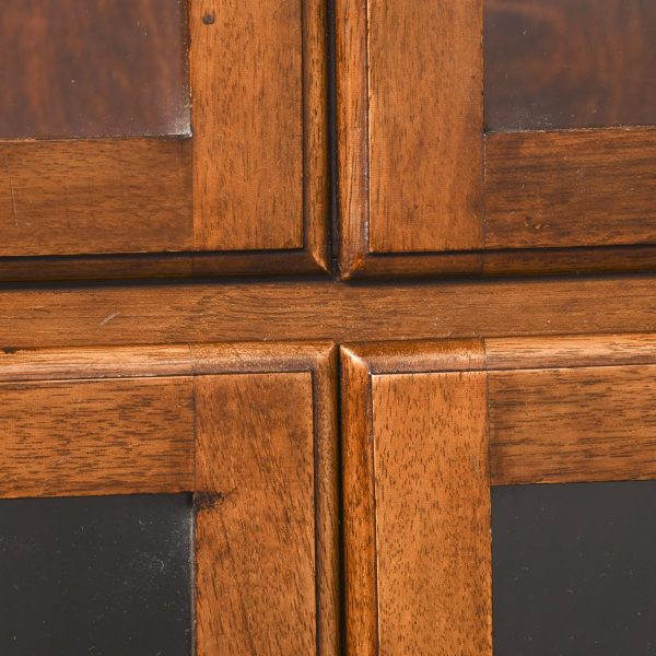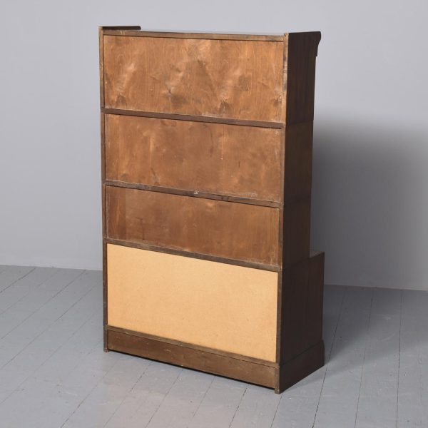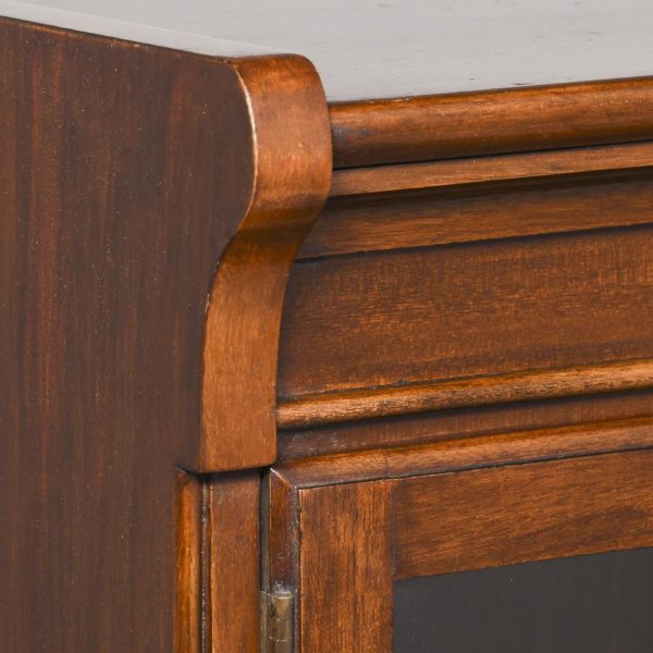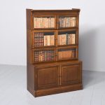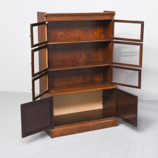 Circa 1900. A neat sized mahogany four tier sectional bookcase. Polished top and shaped fore-edge. With a combination of three pairs of glazed doors, with finely cast brass engraved handles, with the inside of the bookcase been polished, beneath the bottom glazed door there is a flat section and in the base two large panel doors with similar handles. All resting on an enclosed plinth.