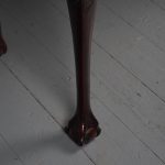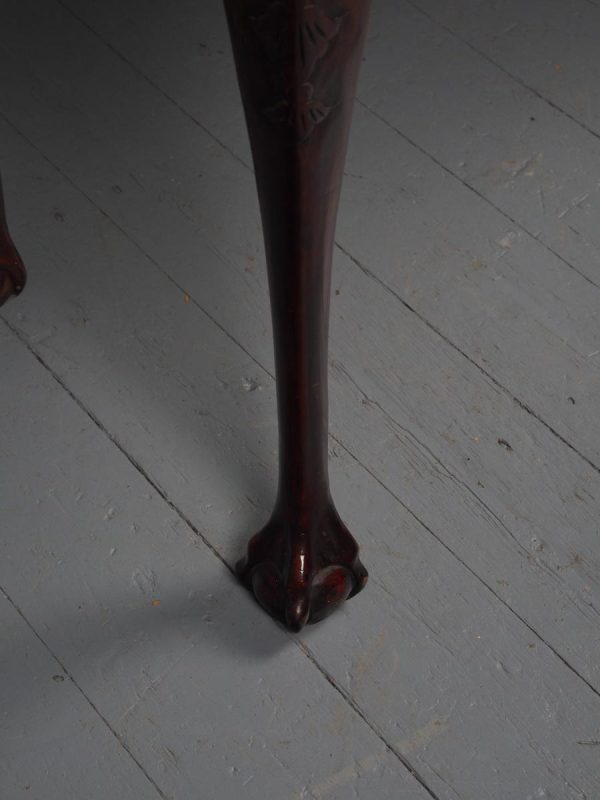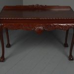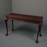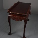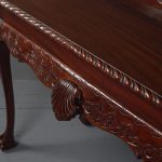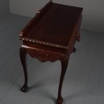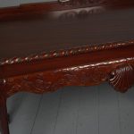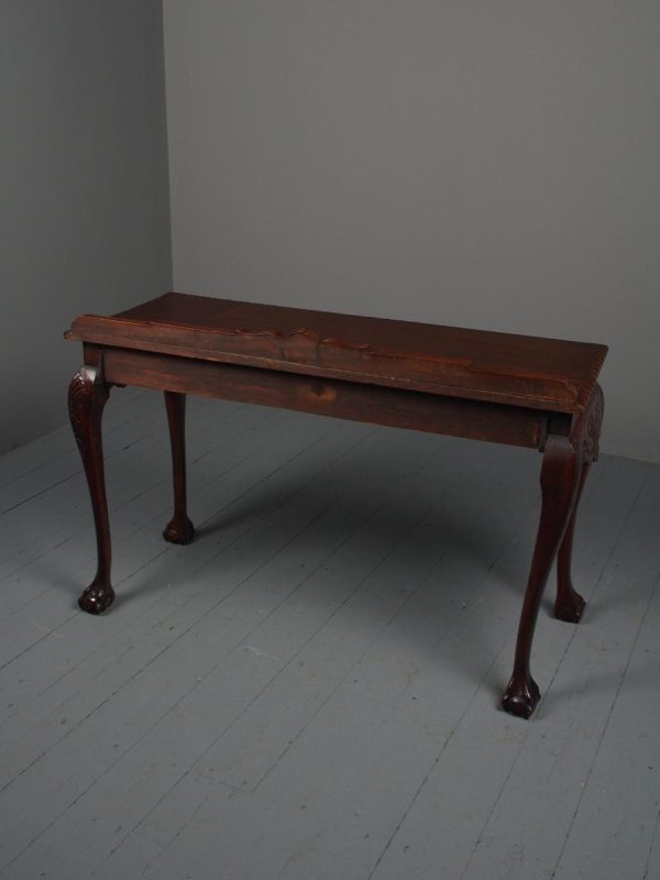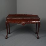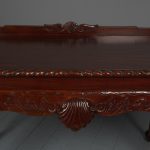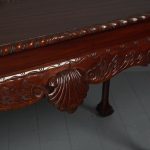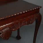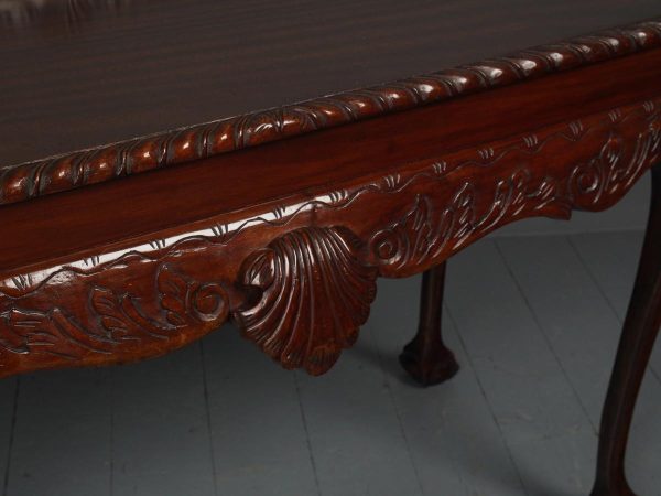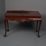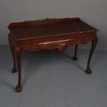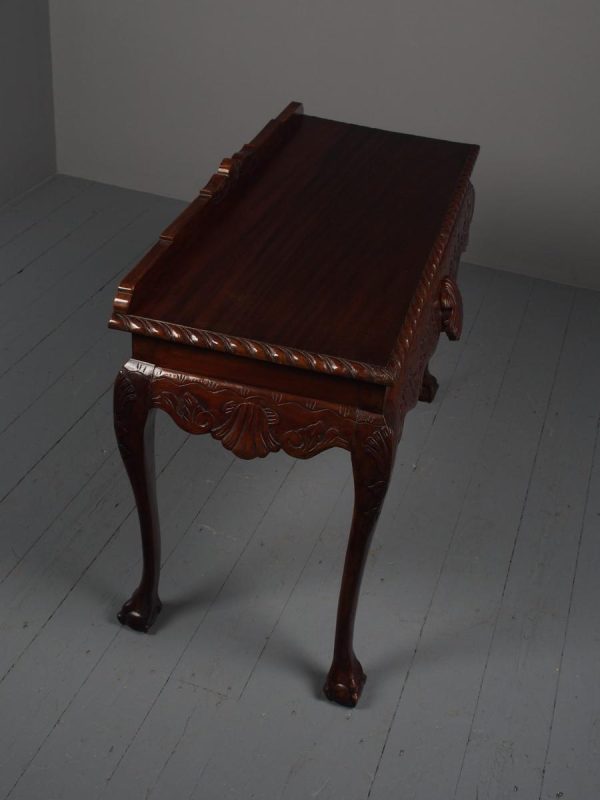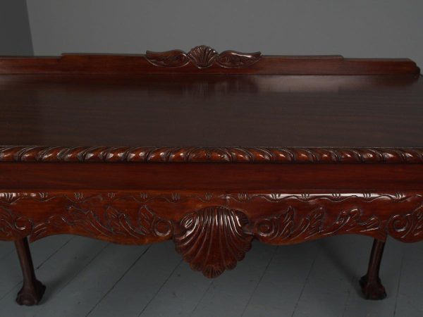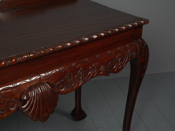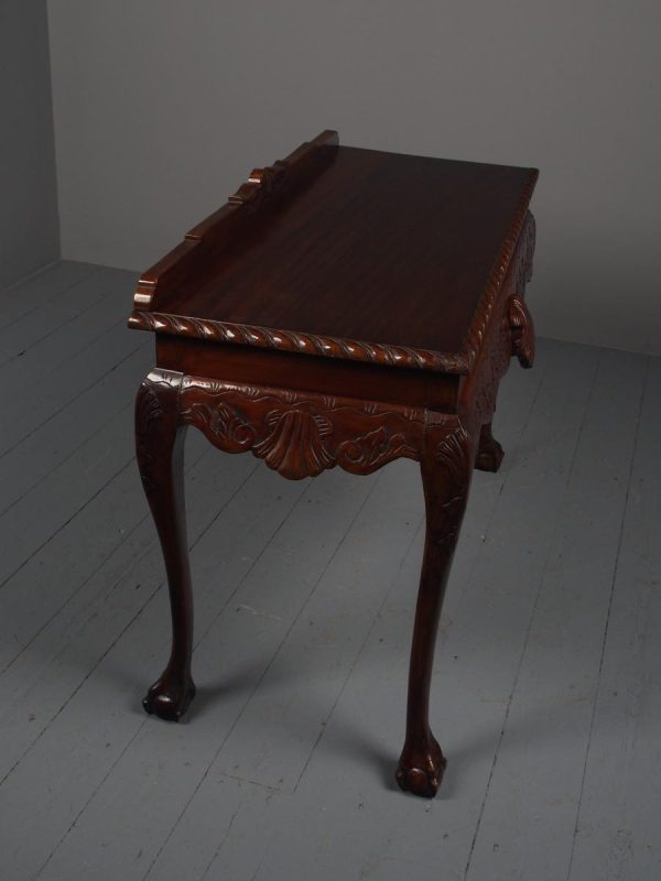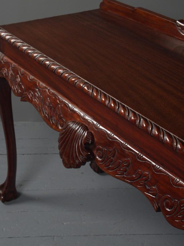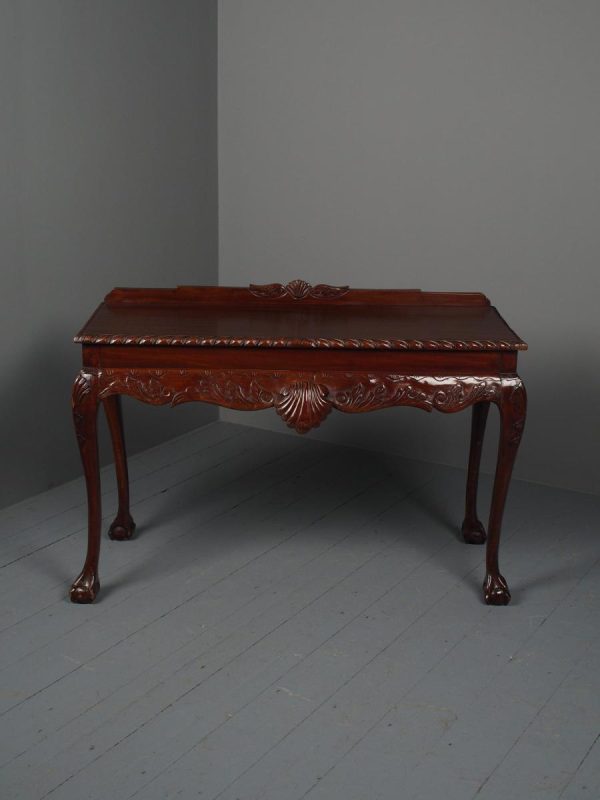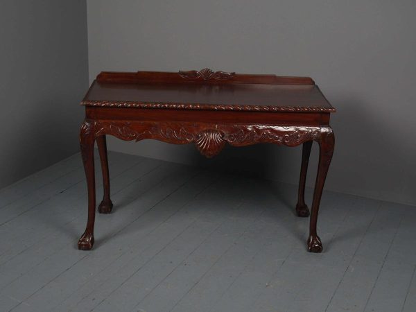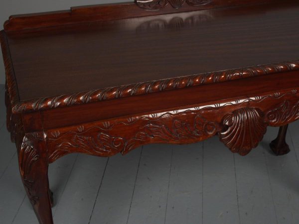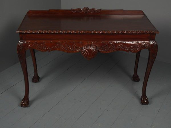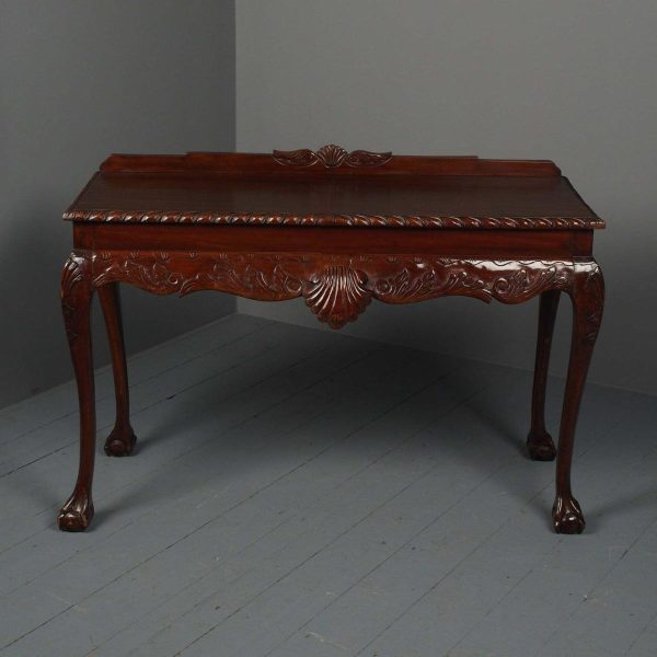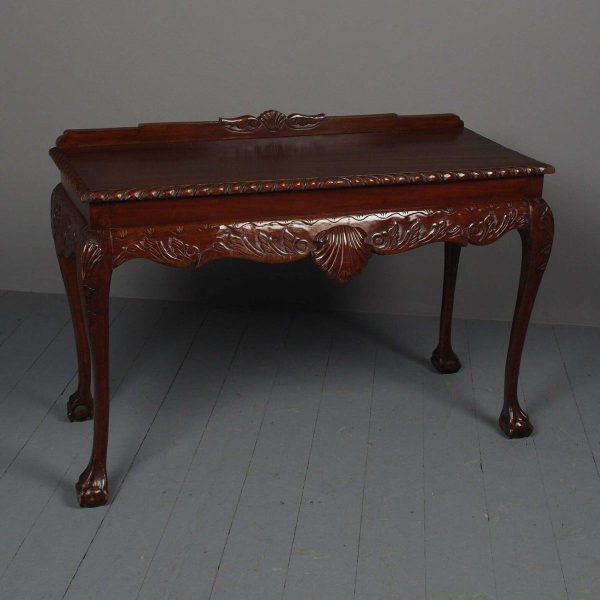 Circa 1900, carved mahogany Irish side table. The rectangular top with carved ledge to back, gadrooned edges, simple frieze and shaped and flared apron with carved, central scallop shell. Standing on 4 cabriole legs with foliate carved knees and standing on ball and claw feet.