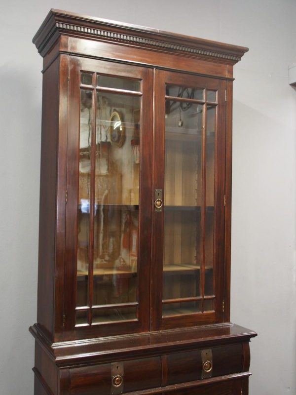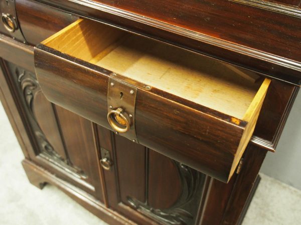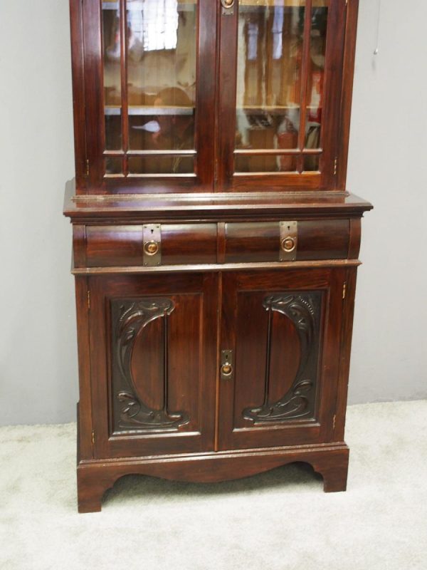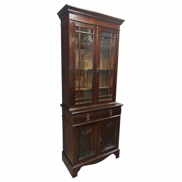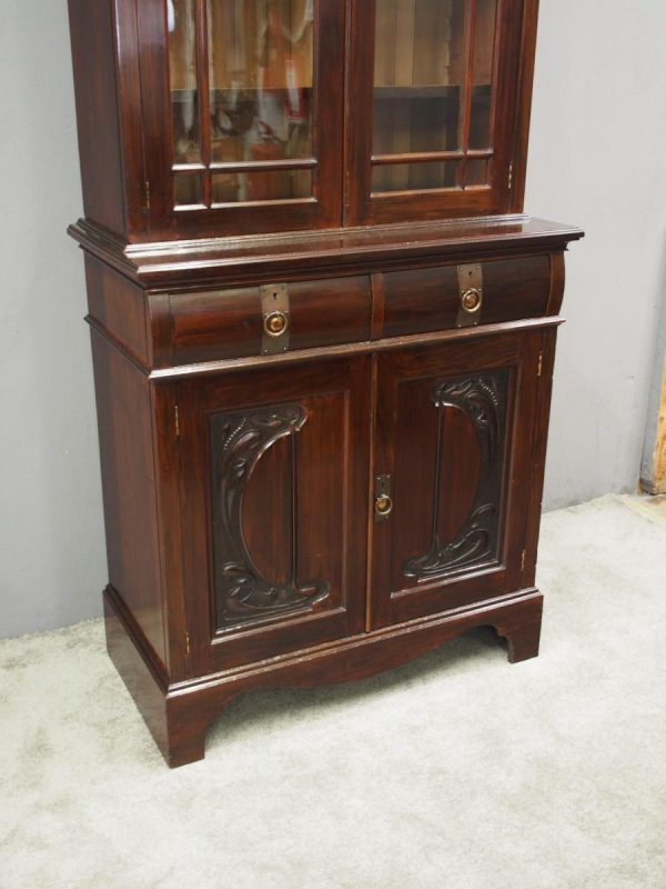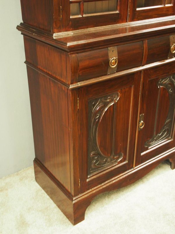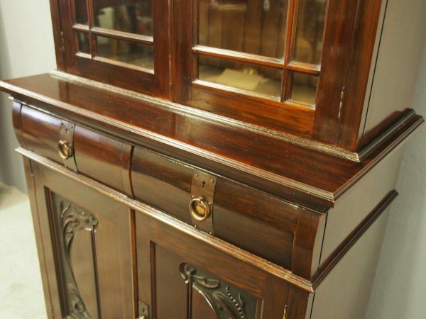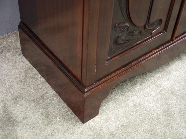 Circa 1900, Art Nouveau stained mahogany cabinet bookcase. The classic dentil top over glazed doors with simple, shaped astragals with brass and oxidised escutcheon, opening to three adjustable shelves. The base with curved, ash-lined drawers with brass strapping over a pair of Art Nouveau carved doors with lily leaf designs, opening to a fixed shelf, supported on faux bracket feet and enclosed plinth.