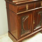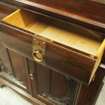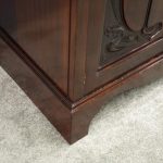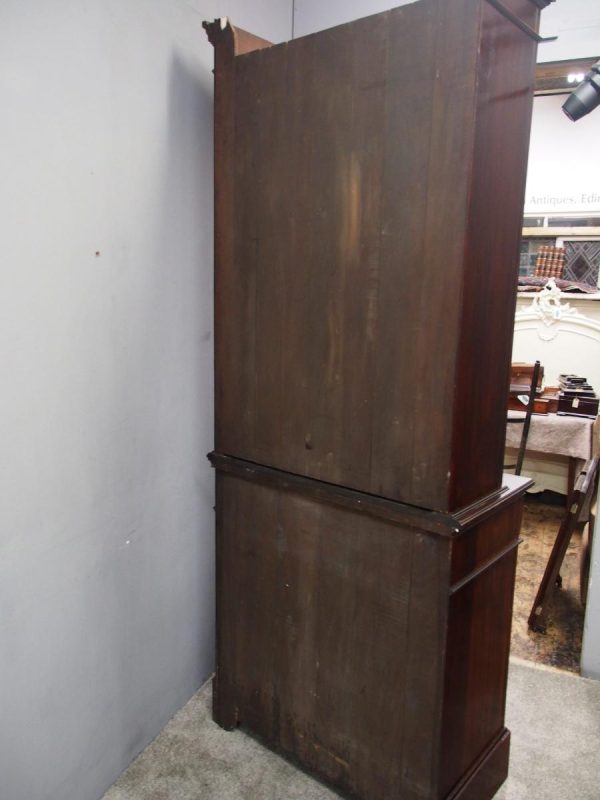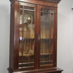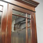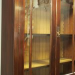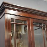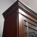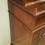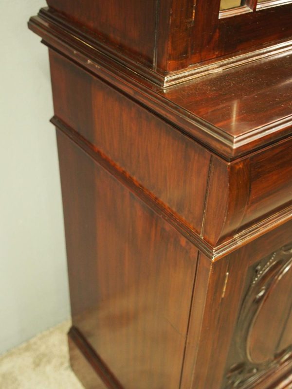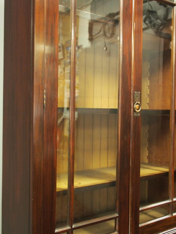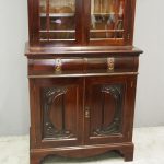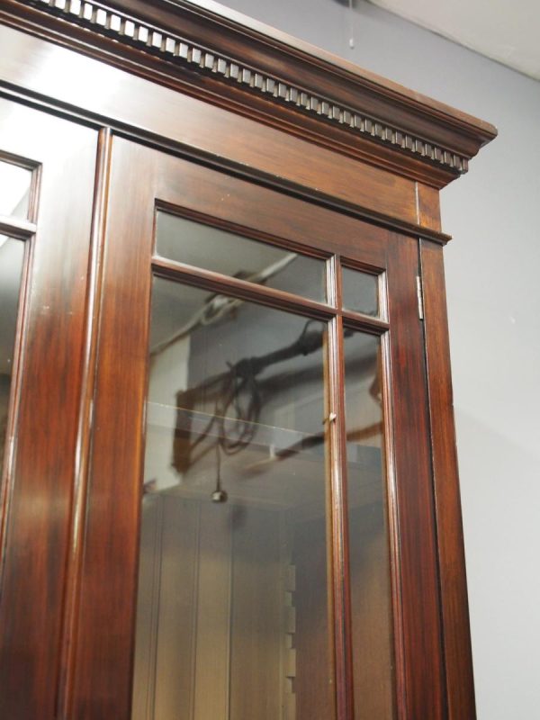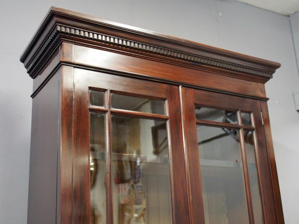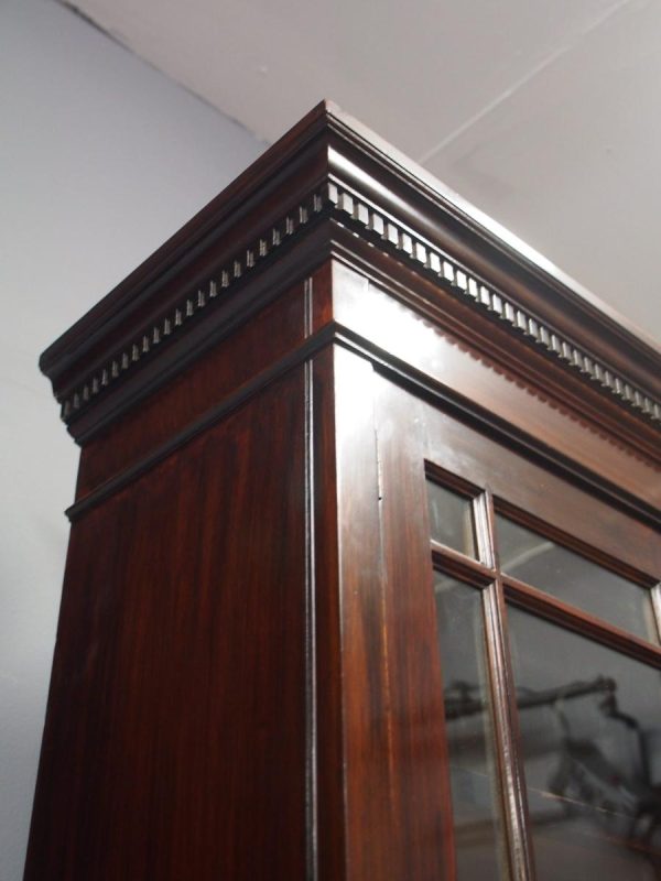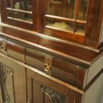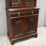 Circa 1900, Art Nouveau stained mahogany cabinet bookcase. The classic dentil top over glazed doors with simple, shaped astragals with brass and oxidised escutcheon, opening to three adjustable shelves. The base with curved, ash-lined drawers with brass strapping over a pair of Art Nouveau carved doors with lily leaf designs, opening to a fixed shelf, supported on faux bracket feet and enclosed plinth.