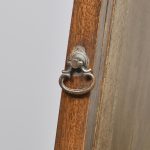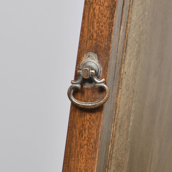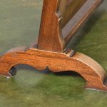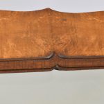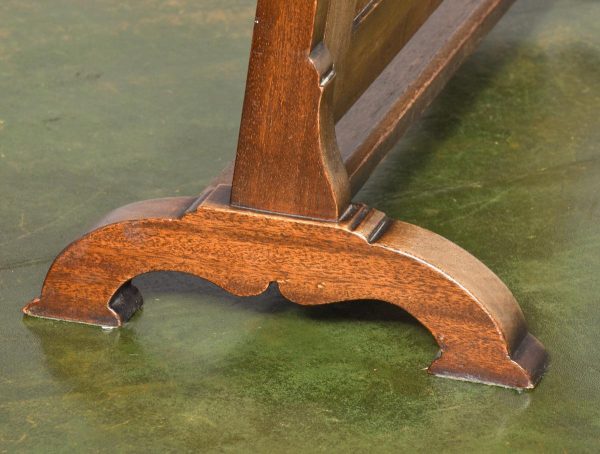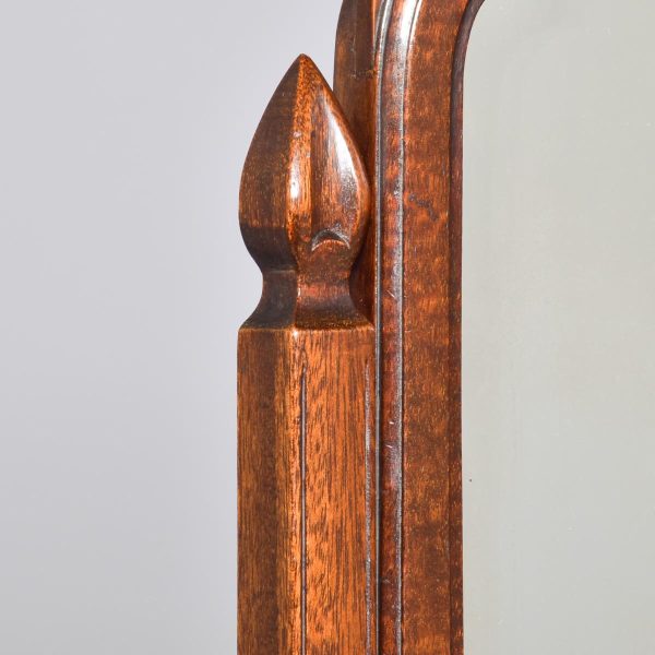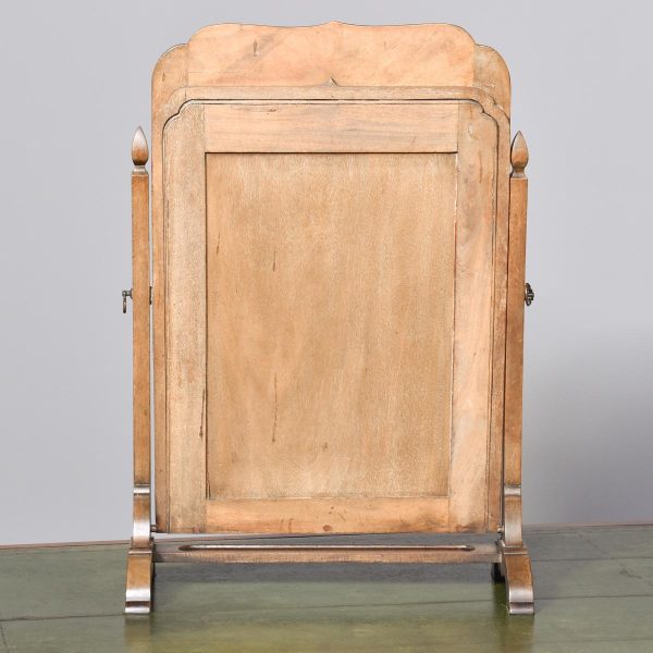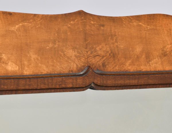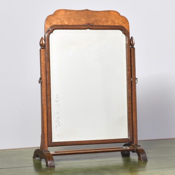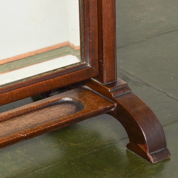 Circa 1930. Mahogany framed dressing mirror by Whytock & Reid of Edinburgh. The rectangular mirror frame with shaped corners surmounted by pediment in mirror-matched flame mahogany is supported on square tapering supports with finials and with brass axe-head screws over a small jewellery shelf and supported on trestle feet. Slight foxing to side of the mirror plate.