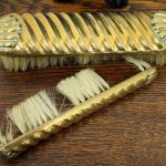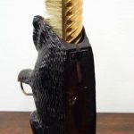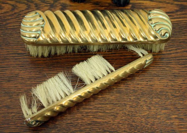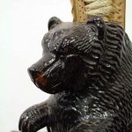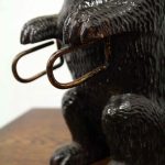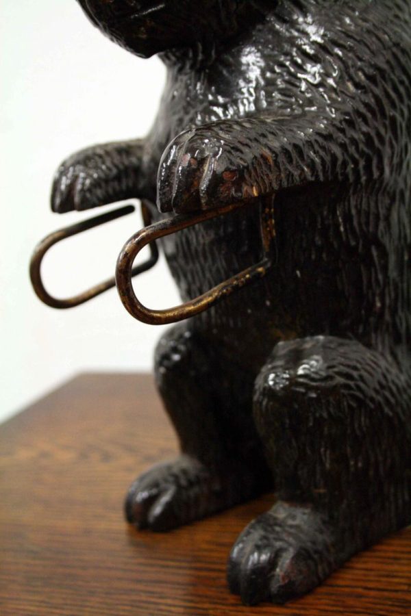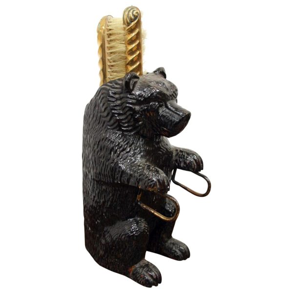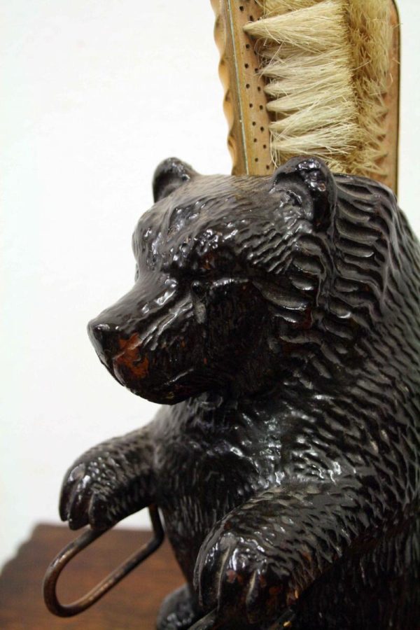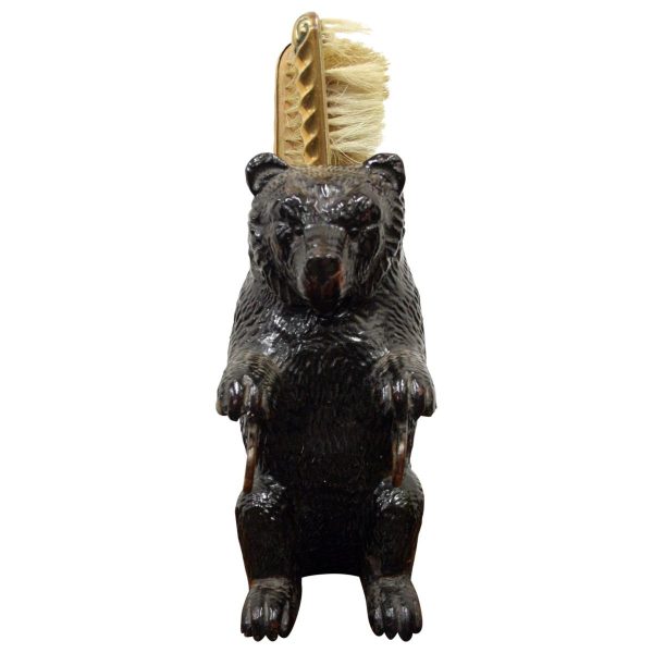 Circa 1900, neat sized Black Forest bear brush holder. The bear is in an upright position with carved features and fur. At the top of the head is an aperture where the brass backed brushes sit, one has lost most of its bristles and this would have hung beneath the paws on the brass hoops. There is a small clasp on the back to hang the brush holder in the hallway.
