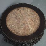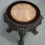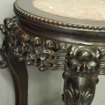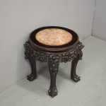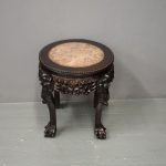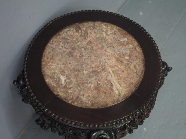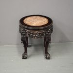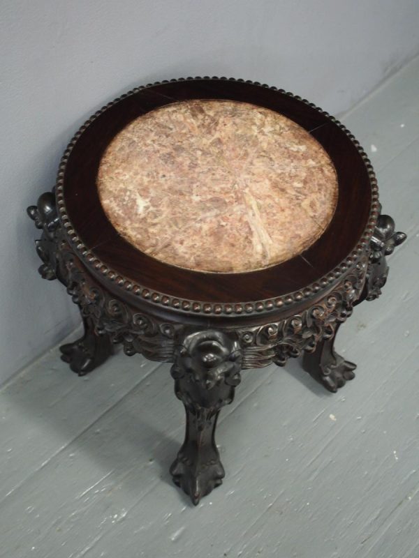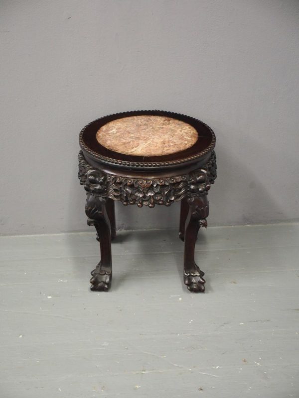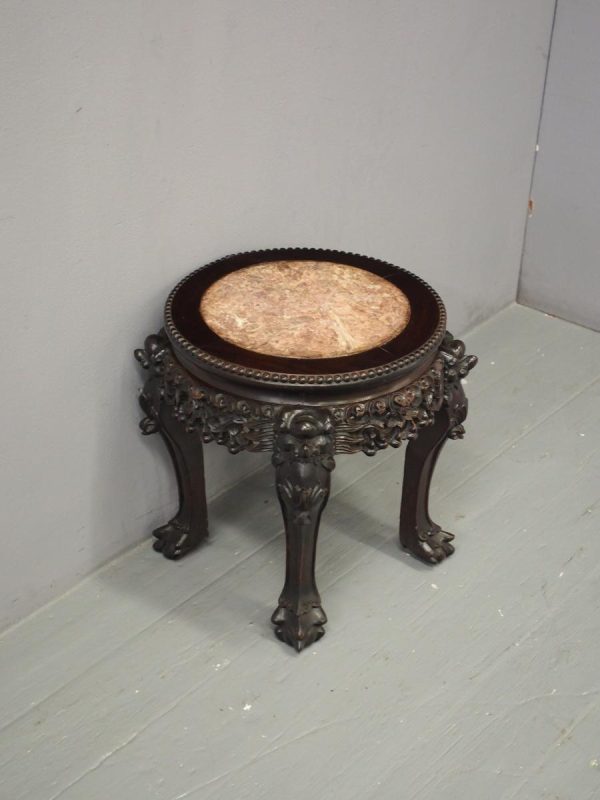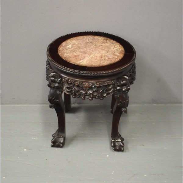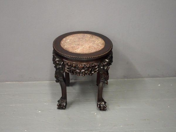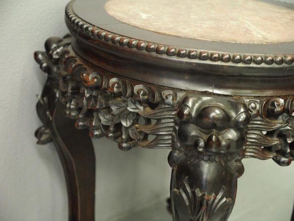 Circa 1900, neat sized Chinese huanghauli and pink marble plant stand. The pink variegated marble is contained in a large frame and beaded edge, with a concave section beneath and open carved fretwork frieze. Standing on 4 classic Chinese feet with mythical heads to the top, carved knees and on animalistic ball and claw feet.
