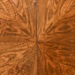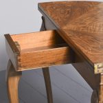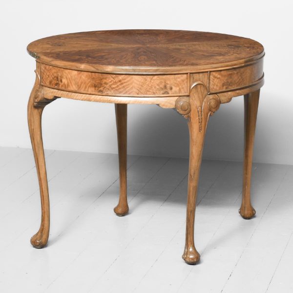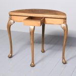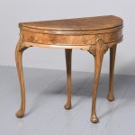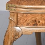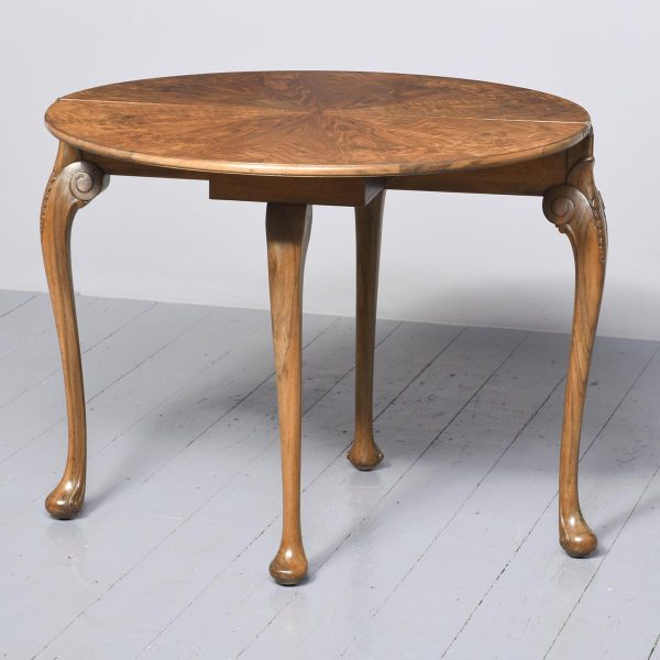 Circa 1930. George II style figured walnut fold over table. The demi-lune top in mirror matched figured walnut with a moulded fore-edge opens to matching figured walnut interior and the supported on extending rear leg. The frieze with beaded panels and supported on cabriole legs with scrolled capitals and scrolled feet. Would make a wonderful hall table.