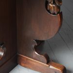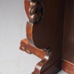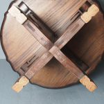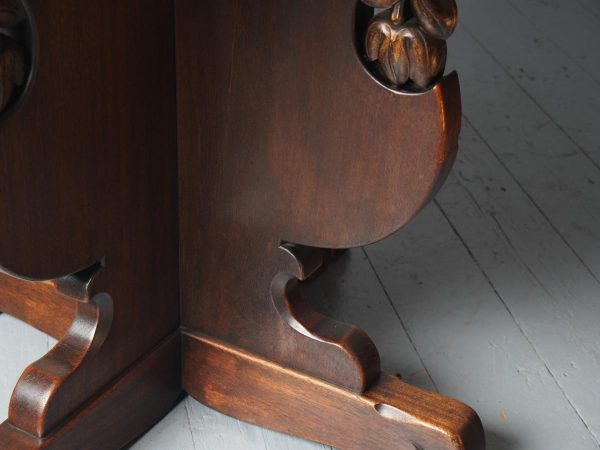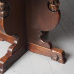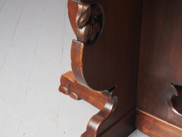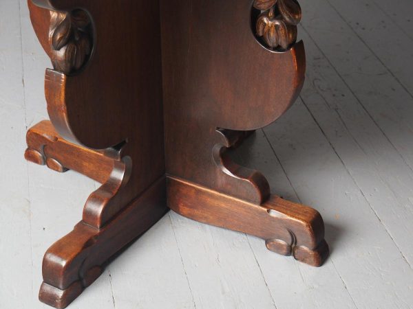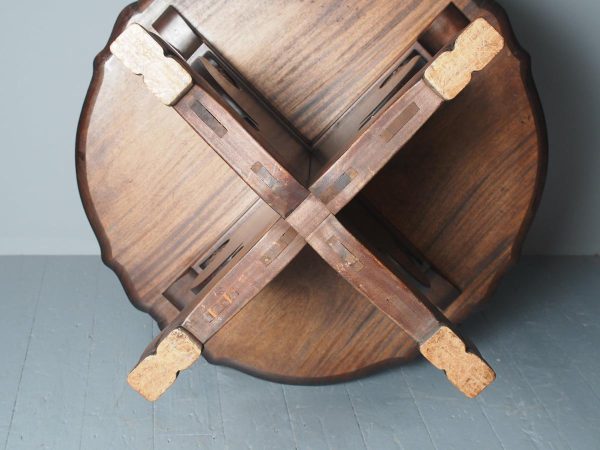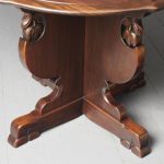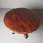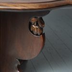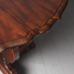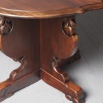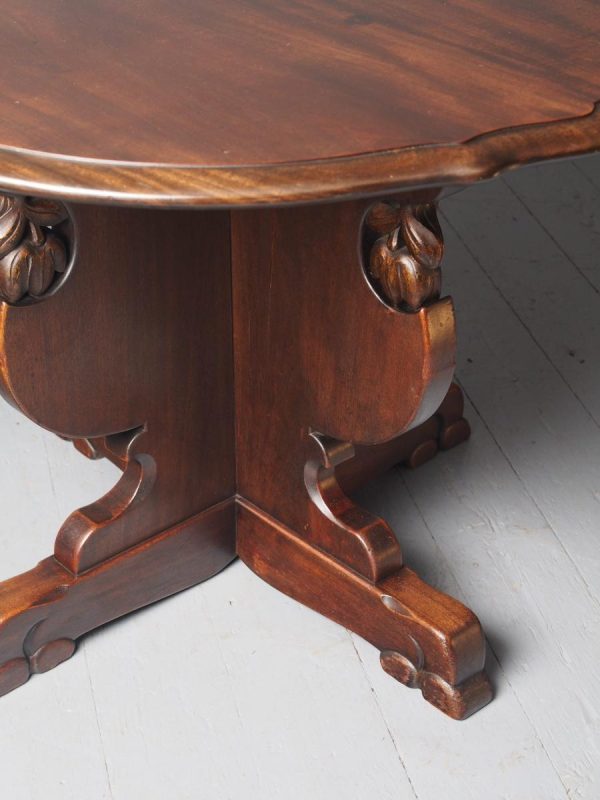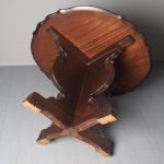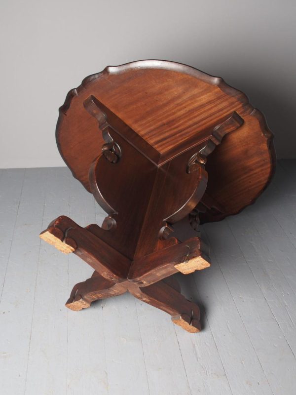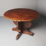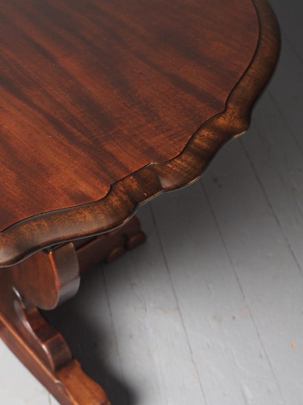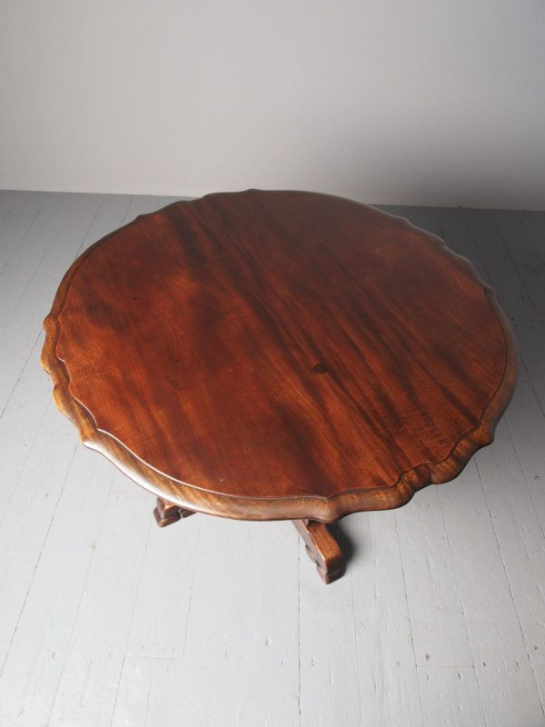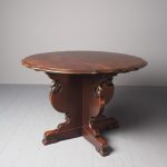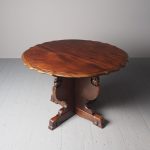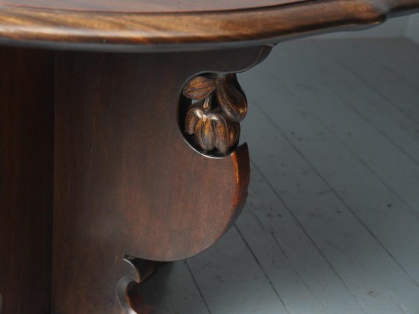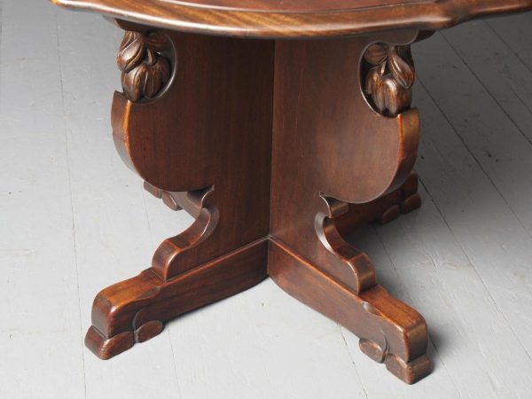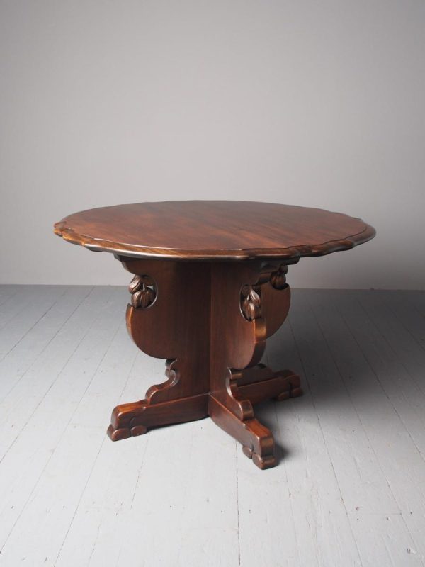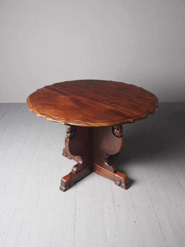 Circa 1920, Sir Robert Lorimer design mahogany centre table, by Whytock and Reid, Edinburgh. The circle top made from a single piece of figured Spanish mahogany, with a moulded, wavy edge. Supported on an unusual 4-part shaped central supports with carved, gilded flowerheads. This extends down on to a cruciform trestle over small shaped feet.