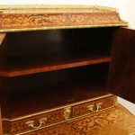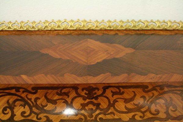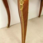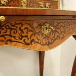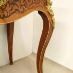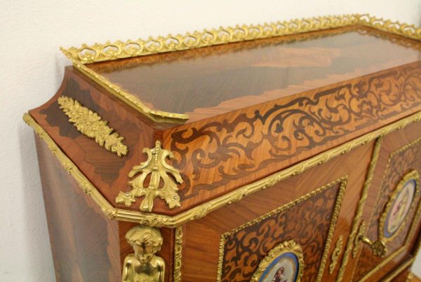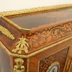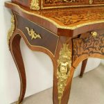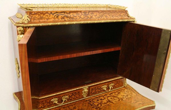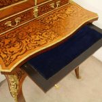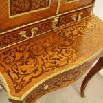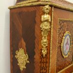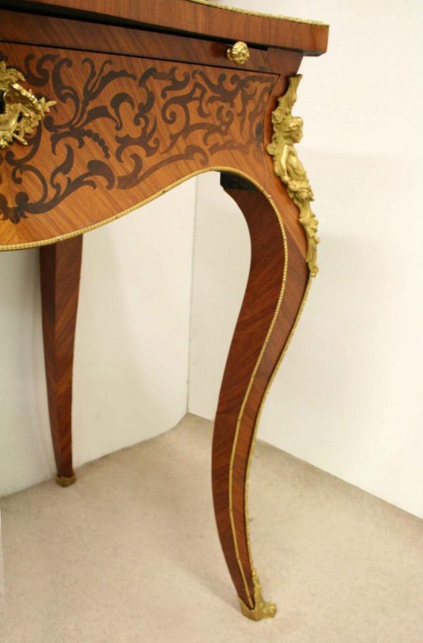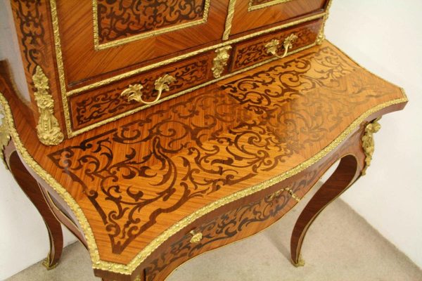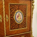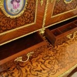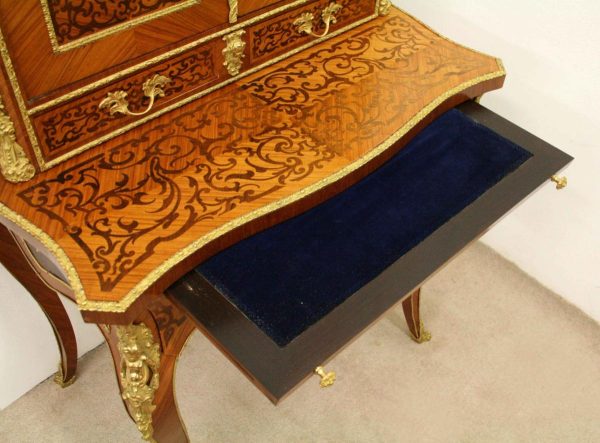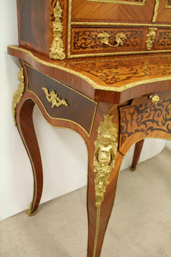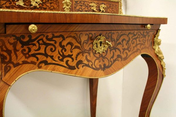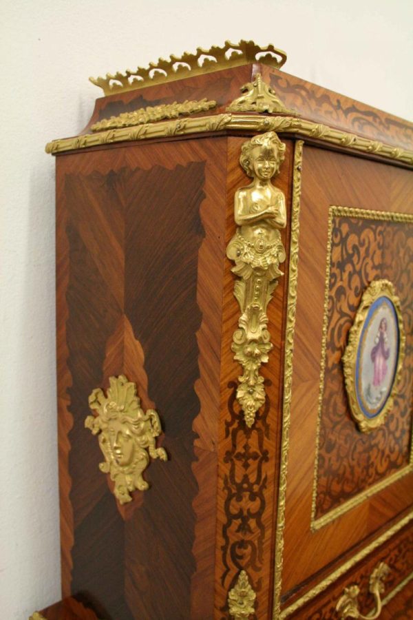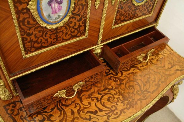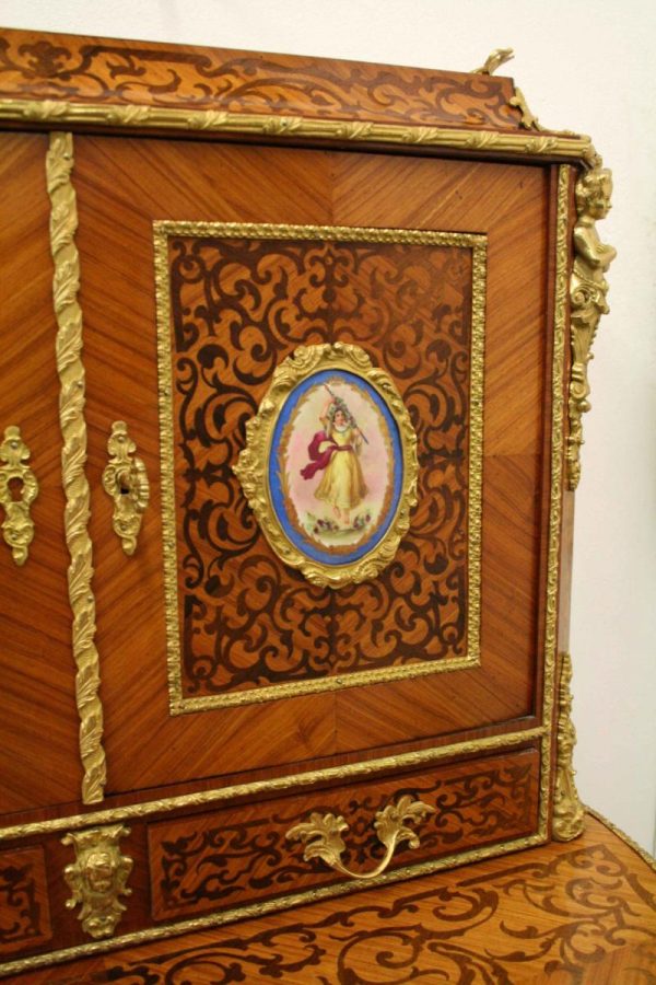 Circa 1900, Louis XVI style kingwood, amaranth, inlaid and porcelain mounted Bonheur du Jour. The superstructure with a pair of doors centred by oval porcelain plaques painted with classical ladies, over a pair of short drawers; the lower part with a writing slide over a frieze drawer, raised on square cabriole legs, the whole outlined with gilt metal mounts.