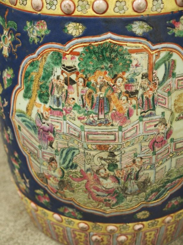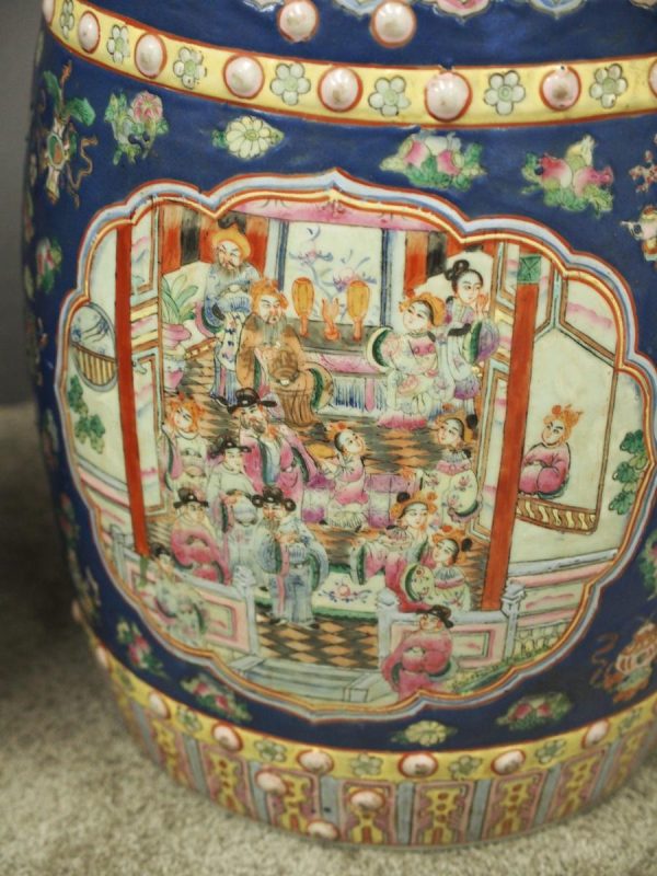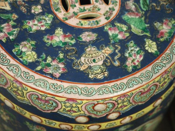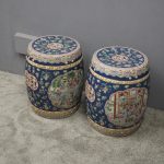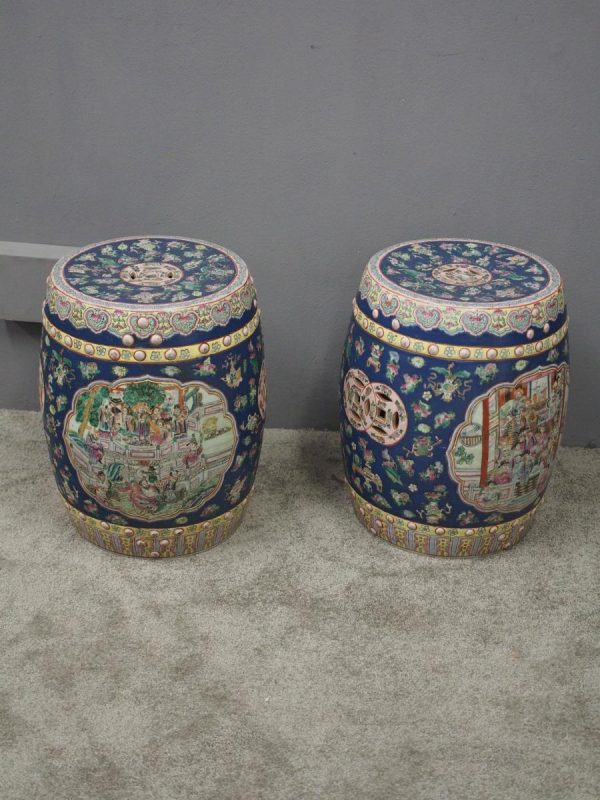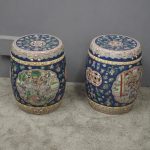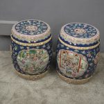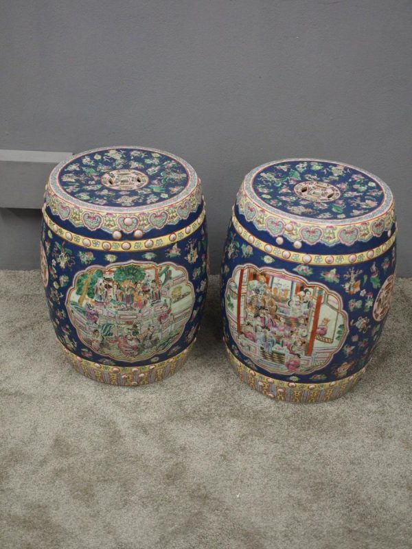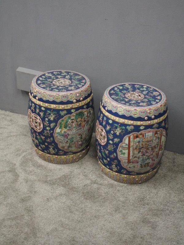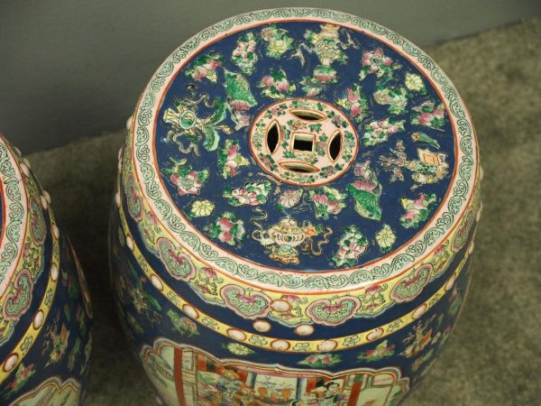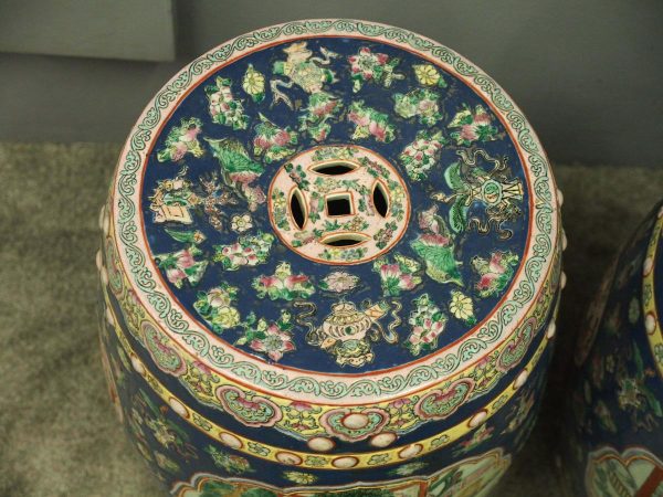 Circa 1900, rare pair of Chinese Qing dynasty painted barrel shaped garden seats. With classical shape, pierced top and painted with Chinese motifs and patterns throughout. One barrel has a hair crack.