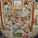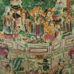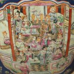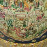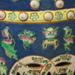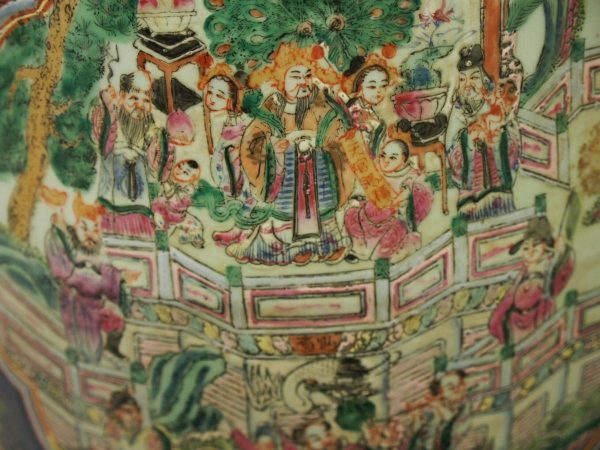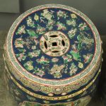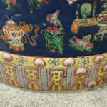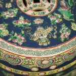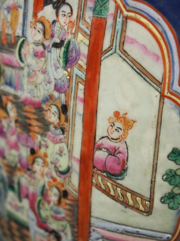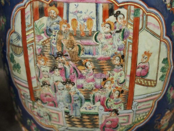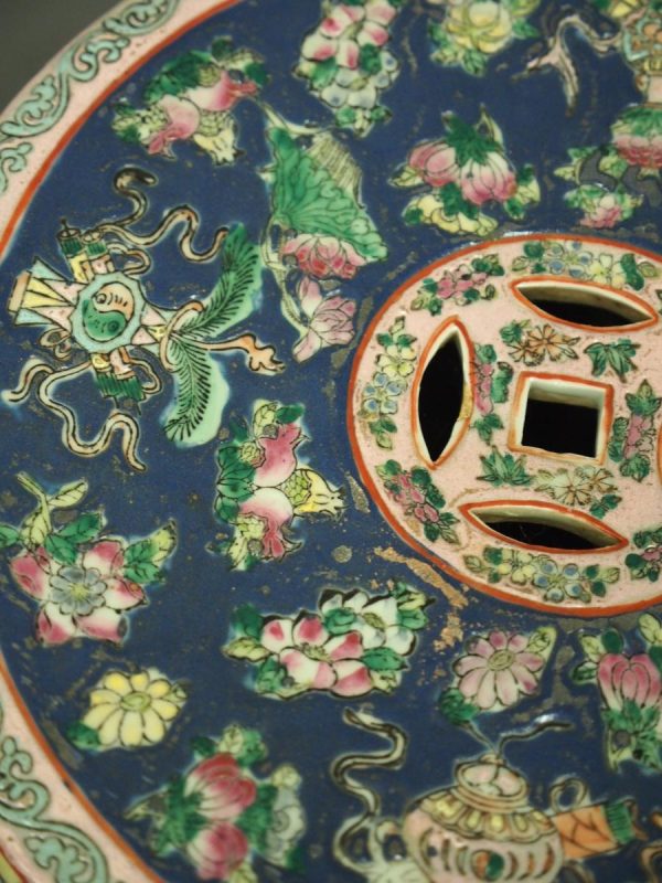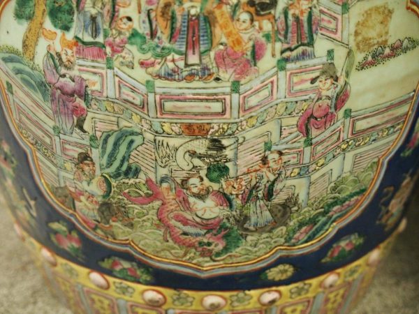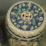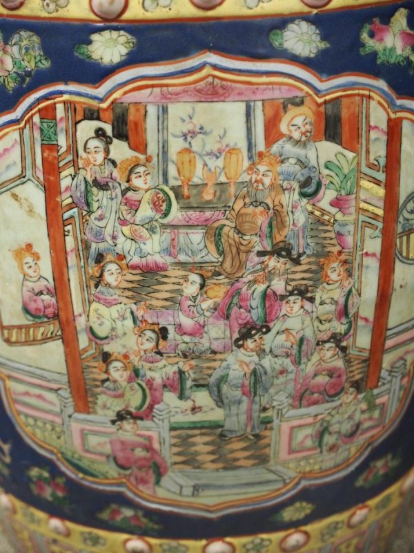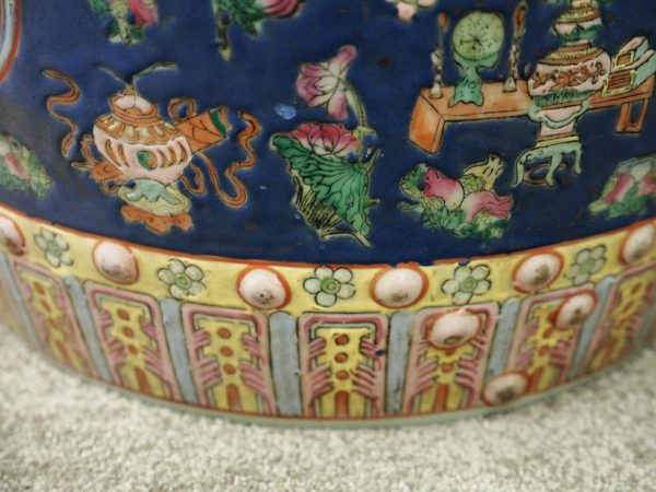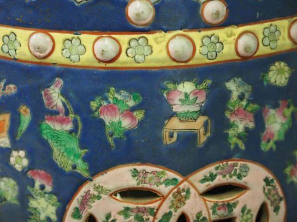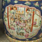 Circa 1900, rare pair of Chinese Qing dynasty painted barrel shaped garden seats. With classical shape, pierced top and painted with Chinese motifs and patterns throughout. One barrel has a hair crack.
