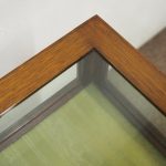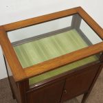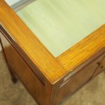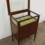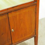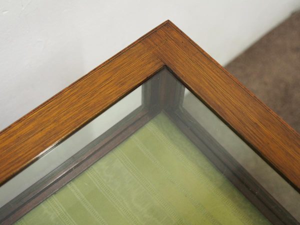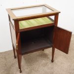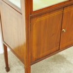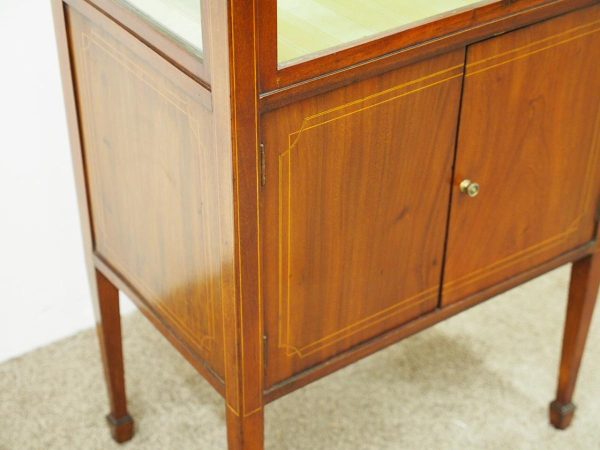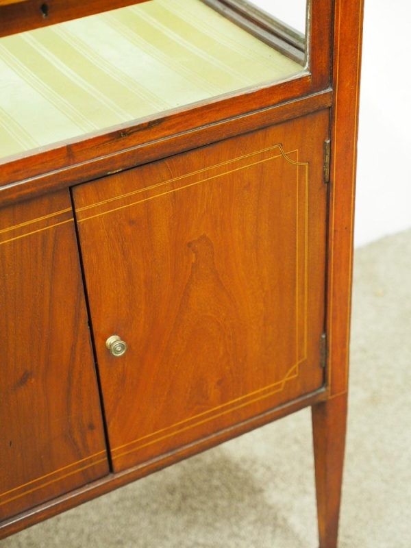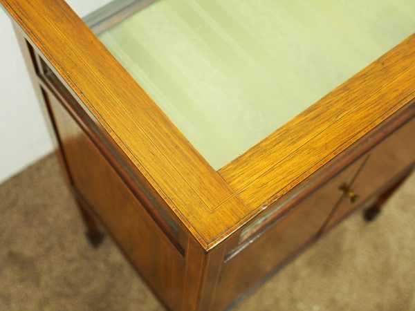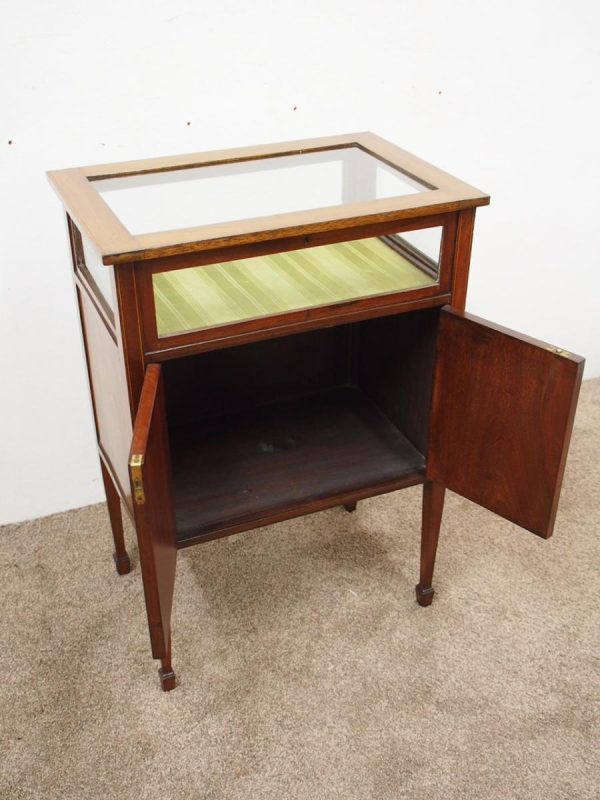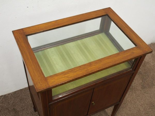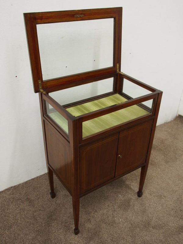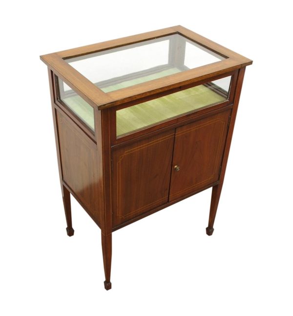 Circa 1900, unusual Sheraton style mahogany bijouterie table. With a hinged top with various inlays and glazed top and walls, it is lockable and the bottom is lined in a silk fabric. Beneath the top are two inlay doors, open to reveal an uninterrupted space, and it all stands on 4 simple, tapering legs which finish on a raised spade toe.