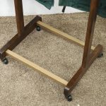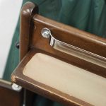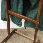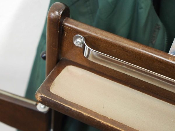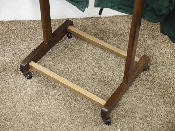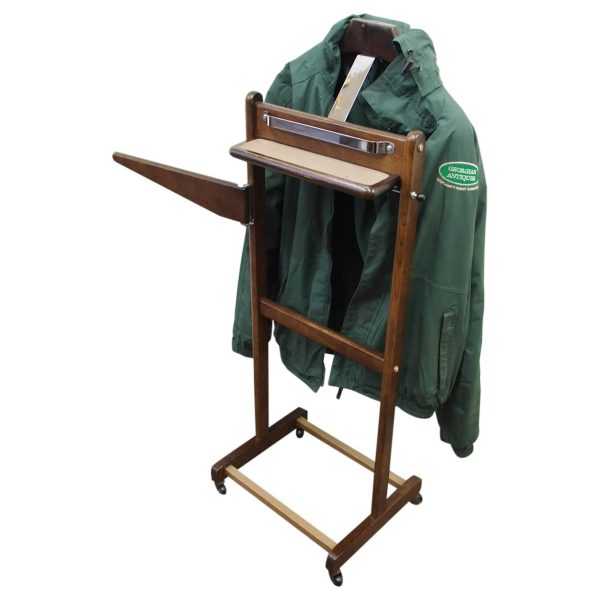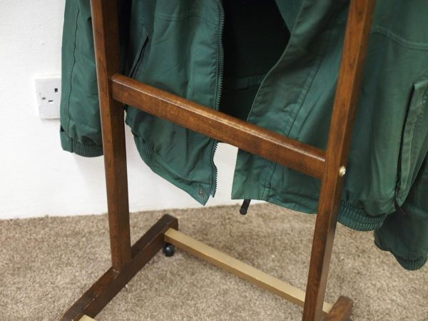 Circa 1970s, freestanding stained beech and chrome valet stand. With a hanger at the back for hanging suits, small dip tray and two pull out arms on the left and right. The whole piece stands on a simple frame with 2 square cross-stretchers and its 4 original squat plastic feet.
