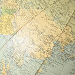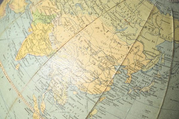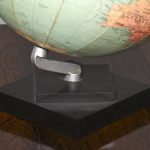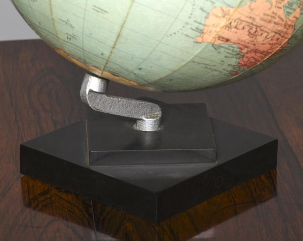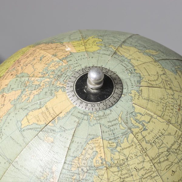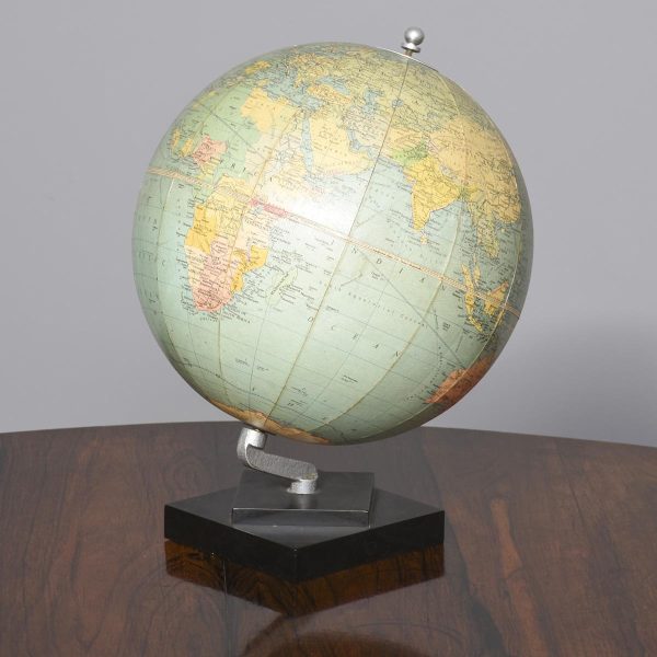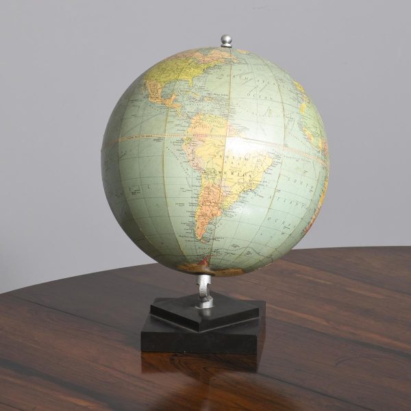 Circa 1960s, paper framed globe on stand. The globe which is tilted to one side and held with a steel rod which goes through the center of the globe, resting on a revolving Bakelite stepped frame. The neat sized globe made by,’ Philips’, 10” Challenge globe.