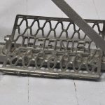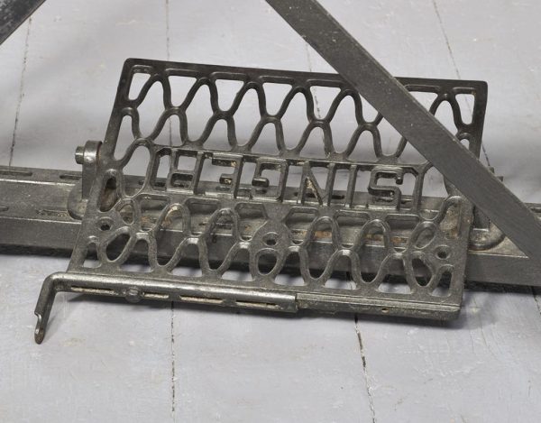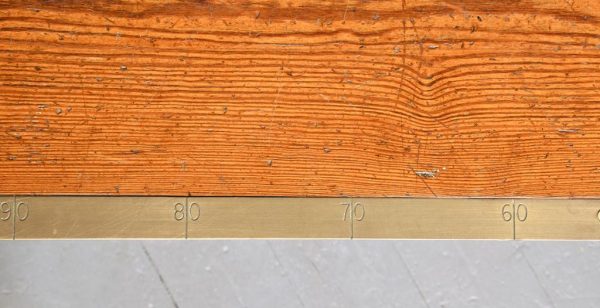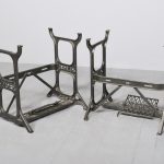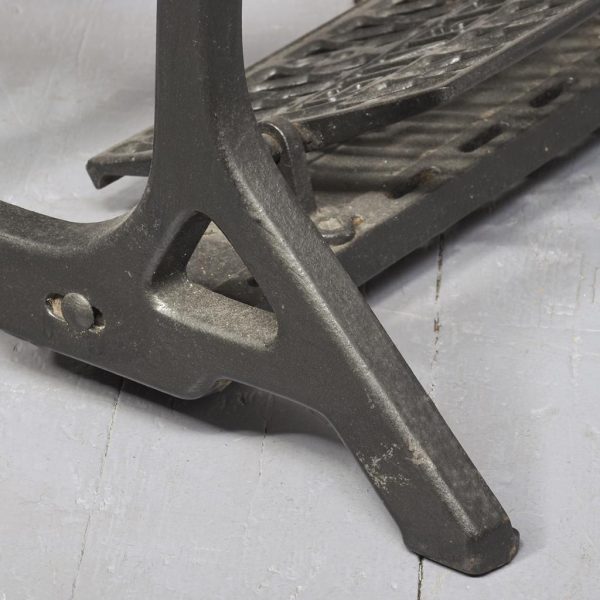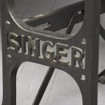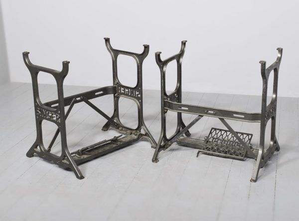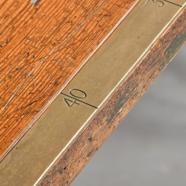Circa 1890 and later. An upcycled pair of Singer sowing machine bases, with the sowing machines removed, have had a plank of pitch pine added to the top, with a brass measuring rod embedded to one side for measuring cloth. (The trestles beneath can have their direction changed).
