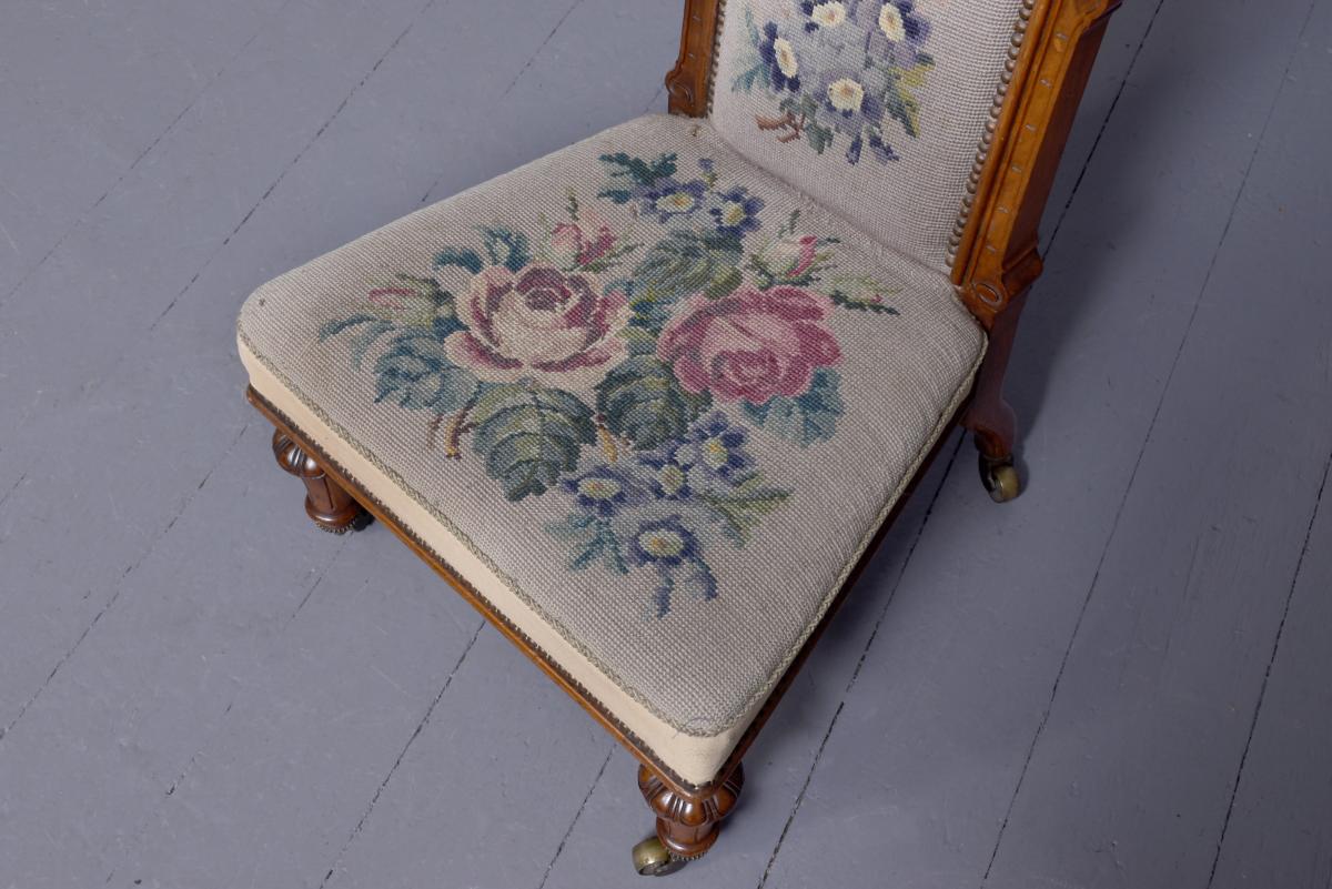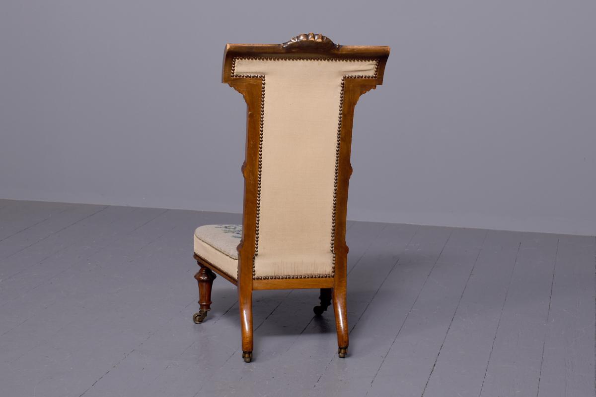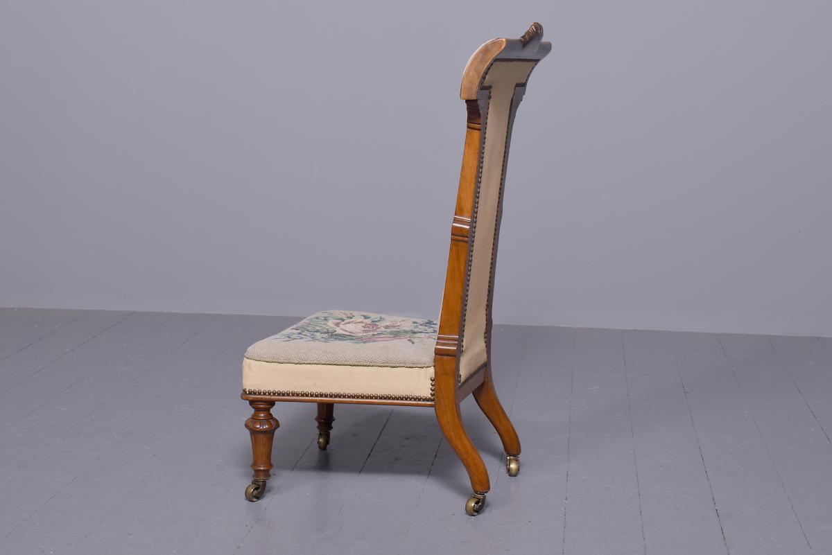 Circa 1870. An Edinburgh made prie-dieu chair, the walnut framed chair of typical shape and style with a carved cresting rail, the T shaped back with foliate carving on the sides, the seat, back and top rail all covered in hand stitched needle point with close back studding, the back legs are turned and slightly out swept and front legs are turned, fluted and flared finishing with stylish brass castors, the underside has three stamps including the design number and ‘R Whytock & Co. Edinburgh’. Prie Dieu, meaning Pray to God, dates from 17th century France where the aristocracy often had this type of stool in a small room or oratory set aside for private prayer’