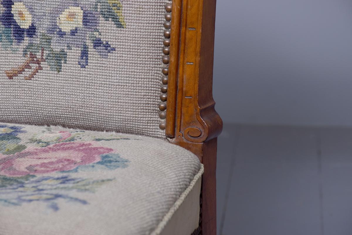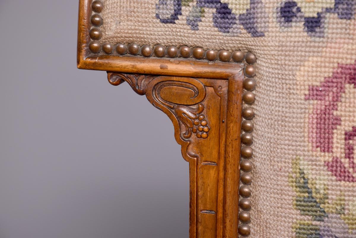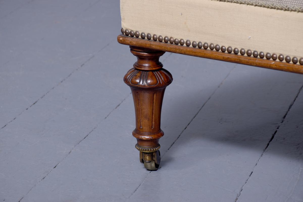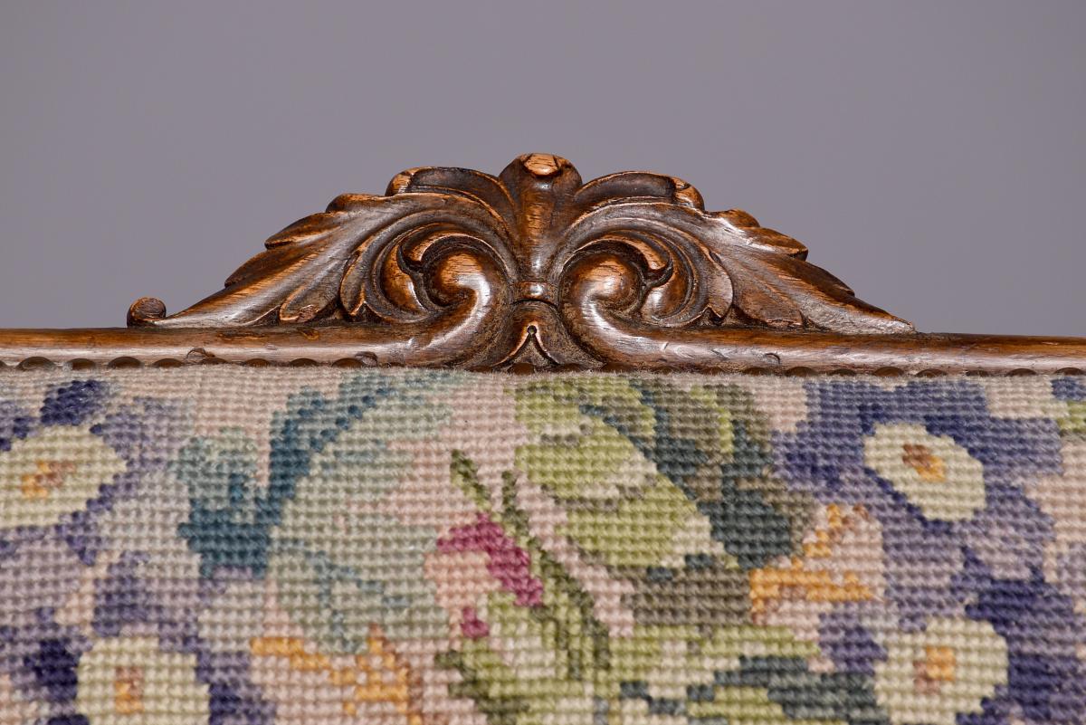 Circa 1870. An Edinburgh made prie-dieu chair, the walnut framed chair of typical shape and style with a carved cresting rail, the T shaped back with foliate carving on the sides, the seat, back and top rail all covered in hand stitched needle point with close back studding, the back legs are turned and slightly out swept and front legs are turned, fluted and flared finishing with stylish brass castors, the underside has three stamps including the design number and ‘R Whytock & Co. Edinburgh’. Prie Dieu, meaning Pray to God, dates from 17th century France where the aristocracy often had this type of stool in a small room or oratory set aside for private prayer’