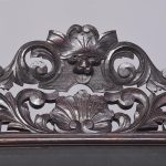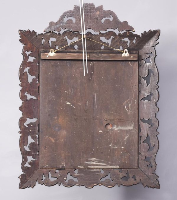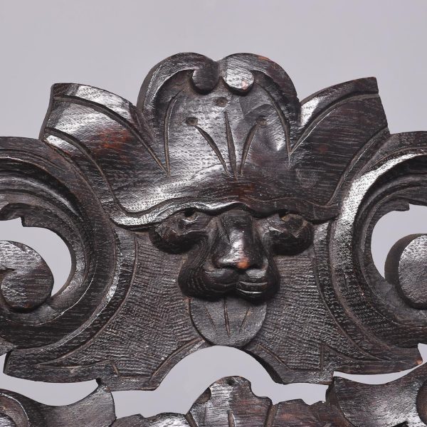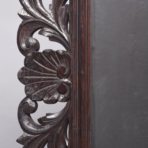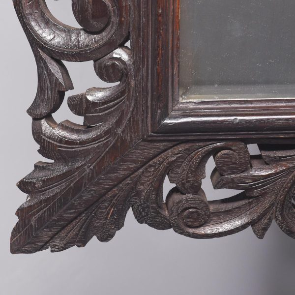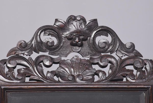 Circa 1870. A carved oak Flemish rectangular wall mirror retaining the original bevel edge mirror plate contained in a moulded slip, the pierced and carved frieze with foliate carving, the top surmounted by a carved mask of a green man with foliate carving.