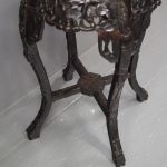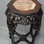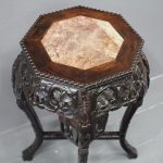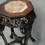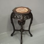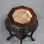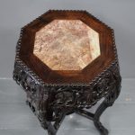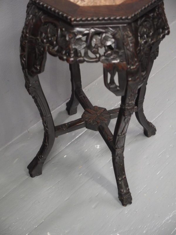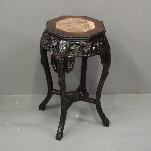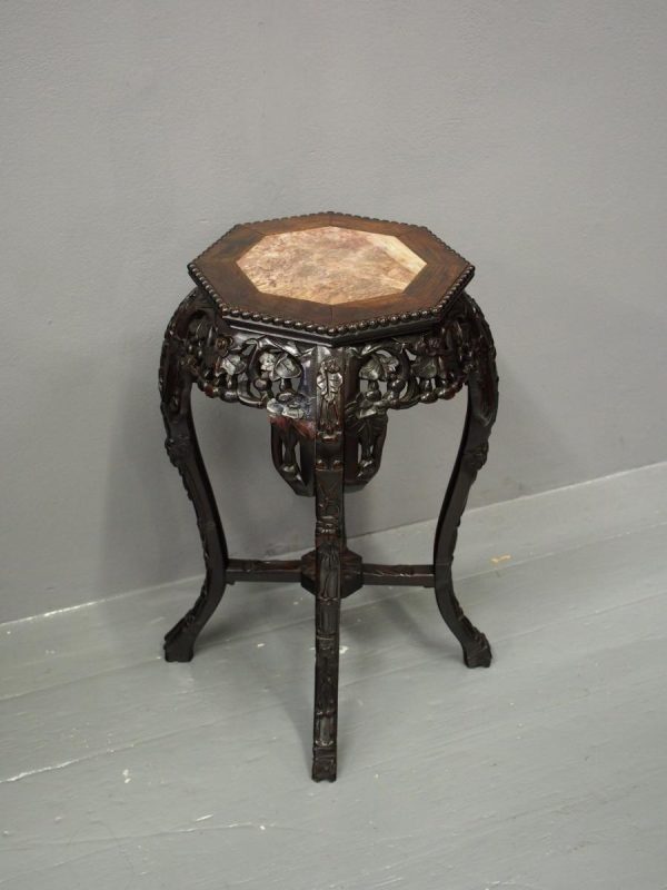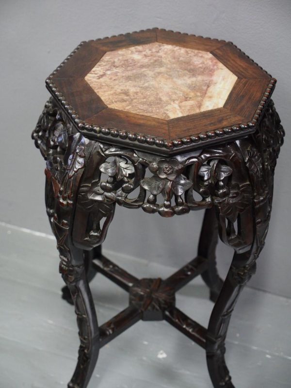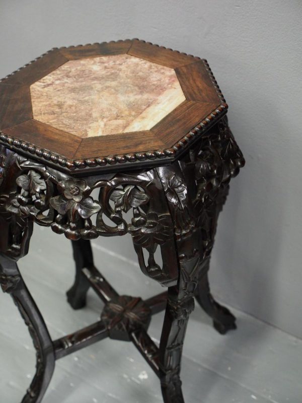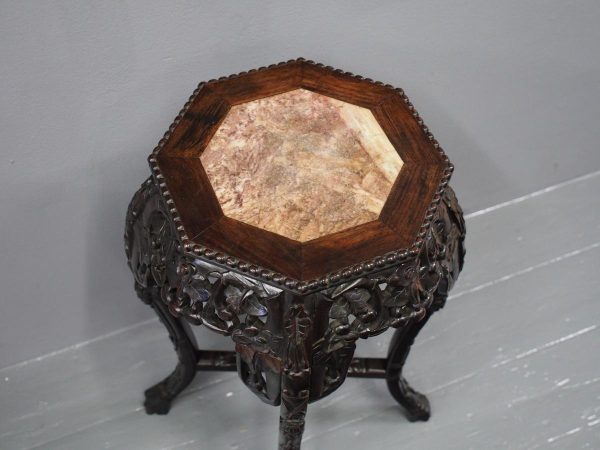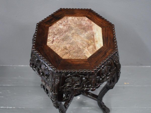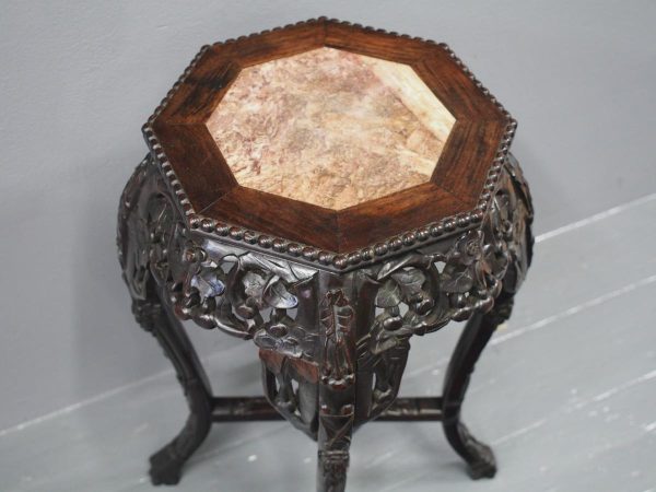 Circa 1900, Qing dynasty Chinese hongmu and pink variegated marble top stand. The insert held in place by a hongmu hand with beaded fore-edge and beneath this is a profusely carved apron that continues all the way down the sides and top of the legs. The 4 shaped cabriole legs have carved facings and towards the base is a faux bamboo cross over stretcher with a central bamboo leaf design. Finishing on 4 classic Chinese feet.