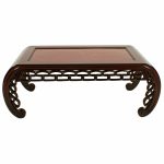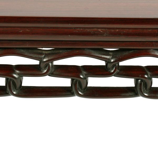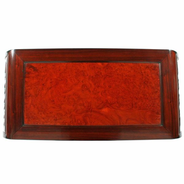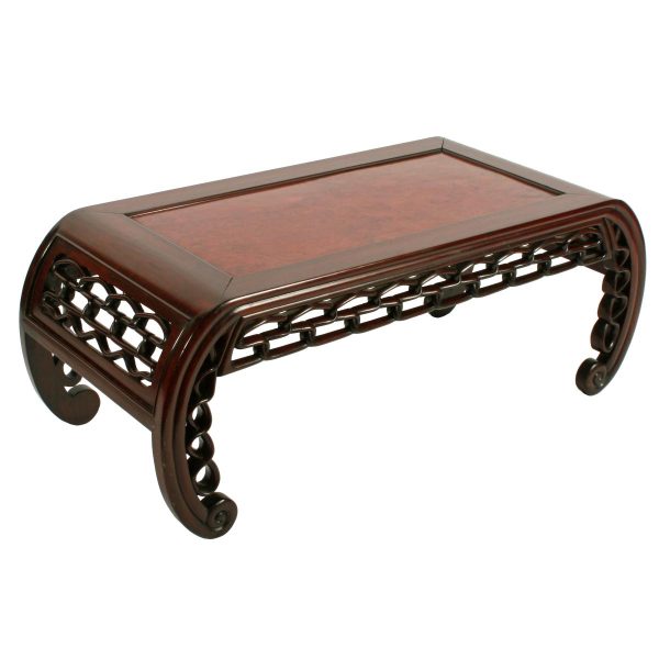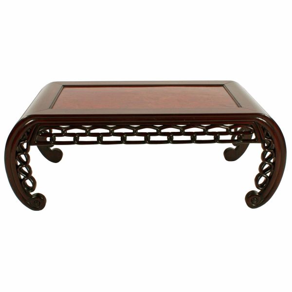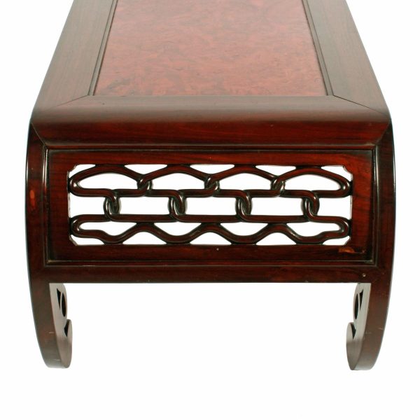Circa 1900. A stylish and elegant Qing Dynasty Hongmu and burr-wood opium table. Rectangular shaped table with burr-wood insert, contained in a beaded moulded frame, the table has a ribbed fore edge and pierced frieze with a continuous pierced chain effect on the front. Curved sides with a similar pattern, finishing on four curved legs with a curled toe.