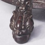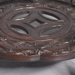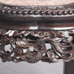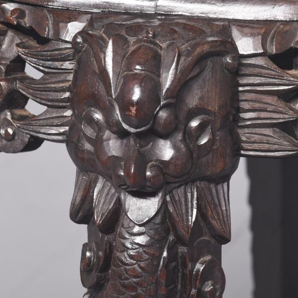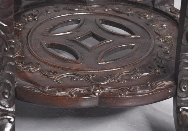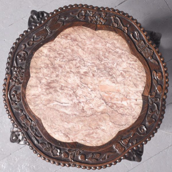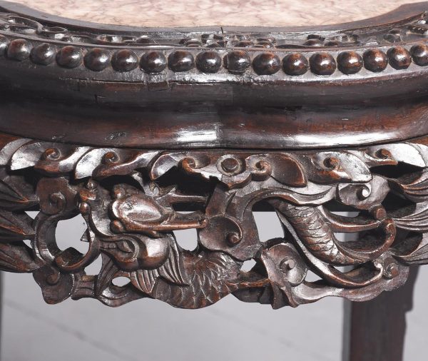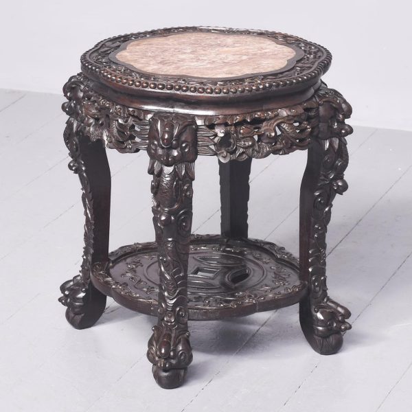 Circa 1890. A Qing Dynasty Hongmu marble topped two tier side table. The petal shaped pink variegated marble top insert within a broad and profusely carved border with a beaded fore-edge, concave frieze and pierced carved apron with many Chinese motifs. Resting on four well carved legs with multiple types of carving on the facing, the legs are braced by a shaped, carved and pierced shelf and resting on four carved feet showing the face of a dragon sitting on a carved circular bun foot.