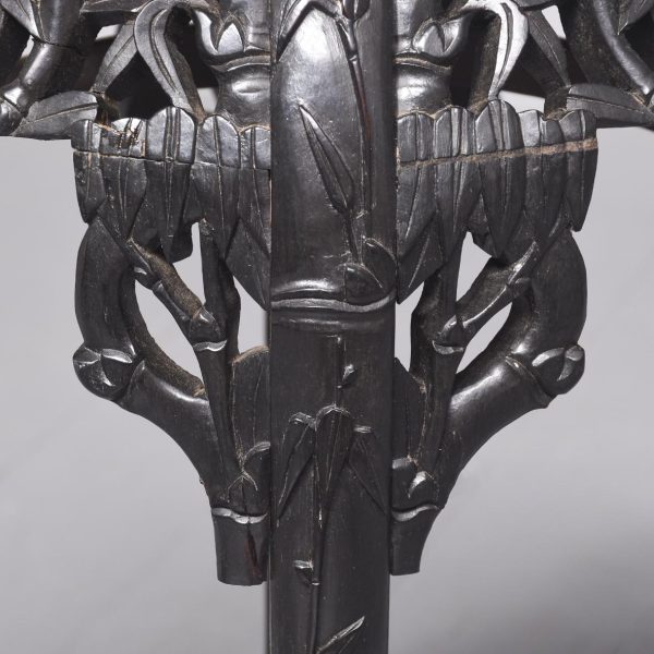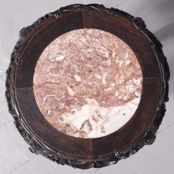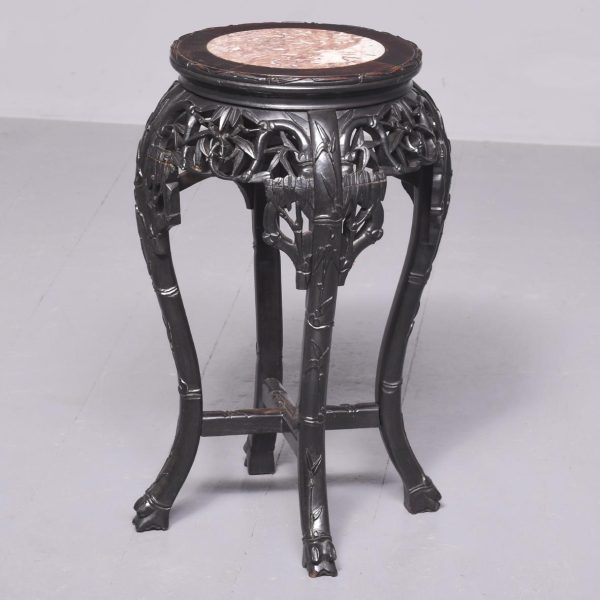 Circa 1890 Qing period Antique Chinese carved hardwood marble top stand. The circular top with pink and white variegated marble surrounded by a faux bamboo carved edge above the bulbous open carved frieze with bamboo leaves and foliage. Supported on cabriole legs with claw feet with carved with bamboo leaves and carved cross stretcher.  In excellent condition.