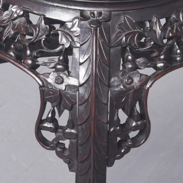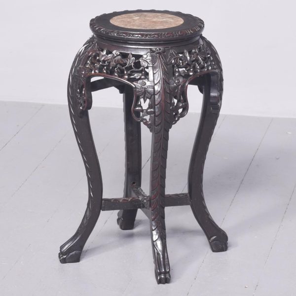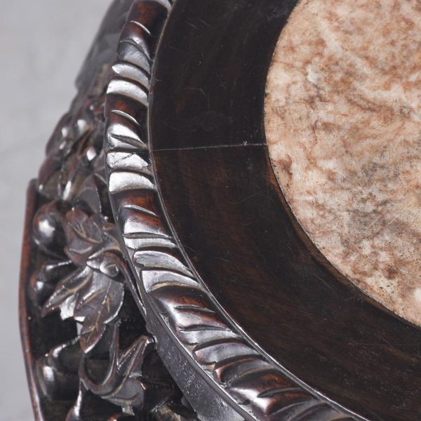Circa 1900.  Qing period carved hardwood marble inset Chinese stand.  The circular top with a variegated pink and brown marble and with a dragooned edge above a bulbous pierced foliate frieze with hand-carved flowers and foliage. Supported on carved cabriole legs with a carved cross stretcher.