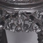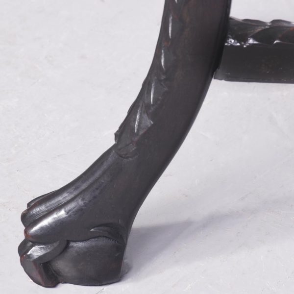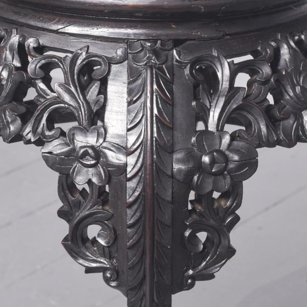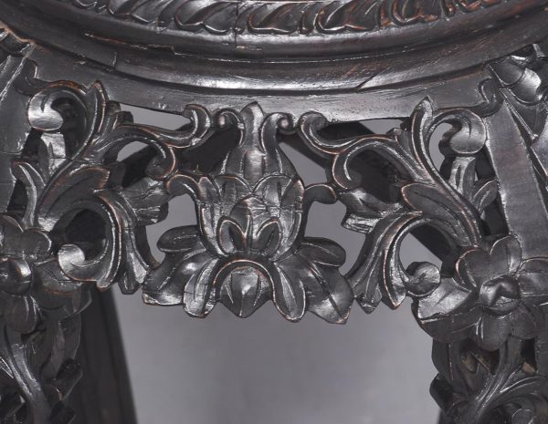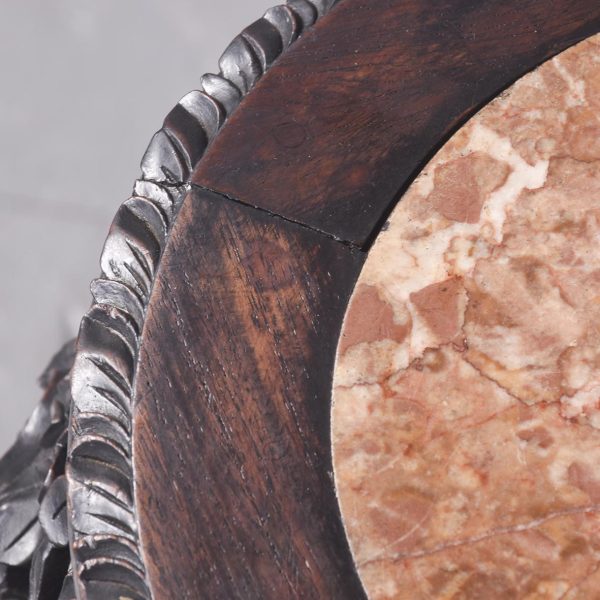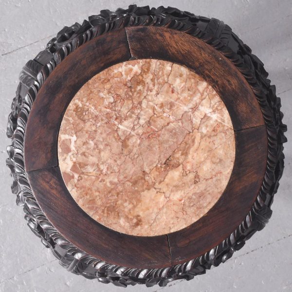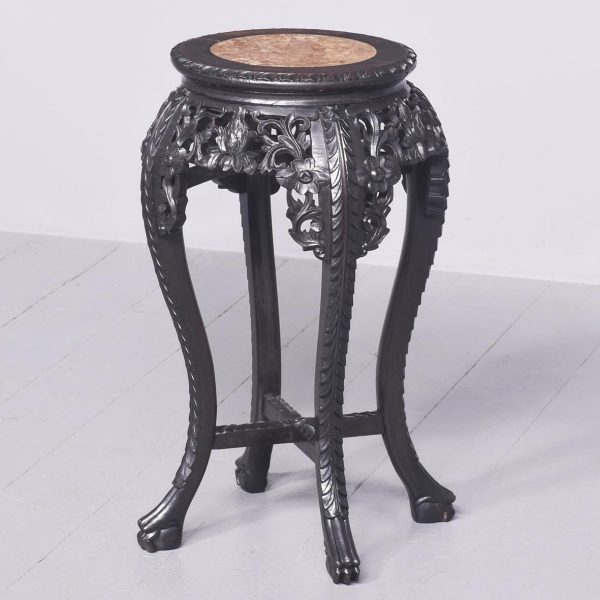 Circa 1890. Qing period Chinese hardwood marble inset plantstand. The circular top with dragooned edges and a variegated pink, cream and grey marble inset above a bulbous pierced frieze with hawthorn flowers and foliate carvings. Supported on carved cabriole legs with a foliate carved undershelf.