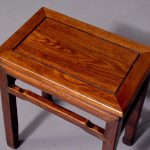 The figured Hongmu top with a central panel over a moulded frieze and geometric shaped stretchers. Supported on tapering feet with classical neat Chinese feet. Solid functional table with a lovely colour and patina.