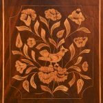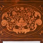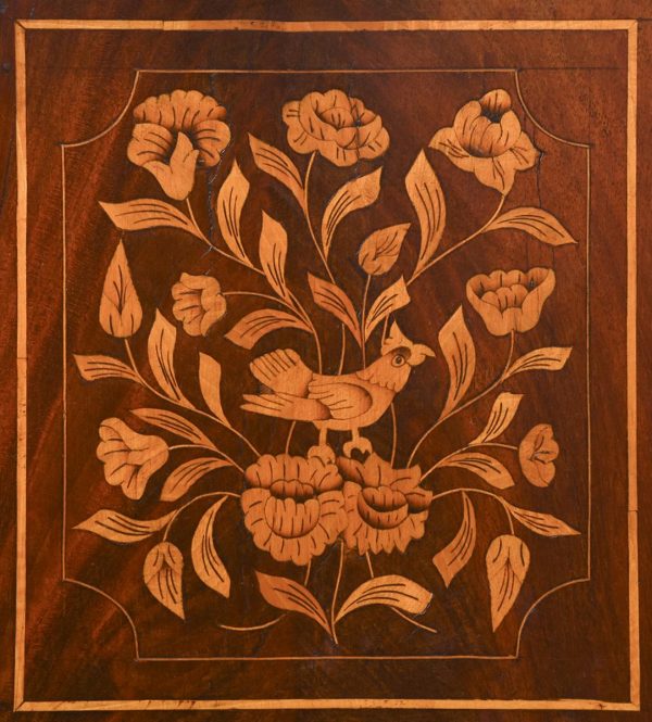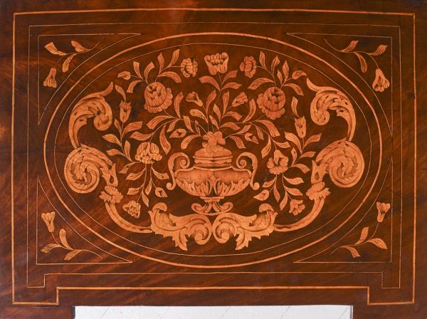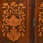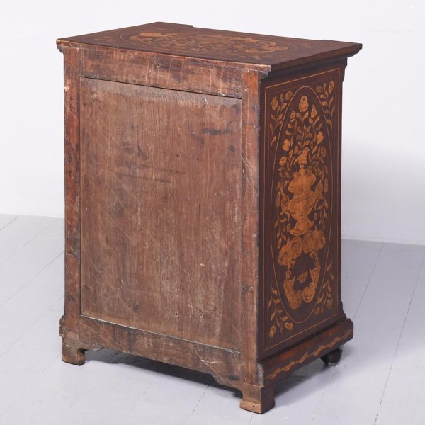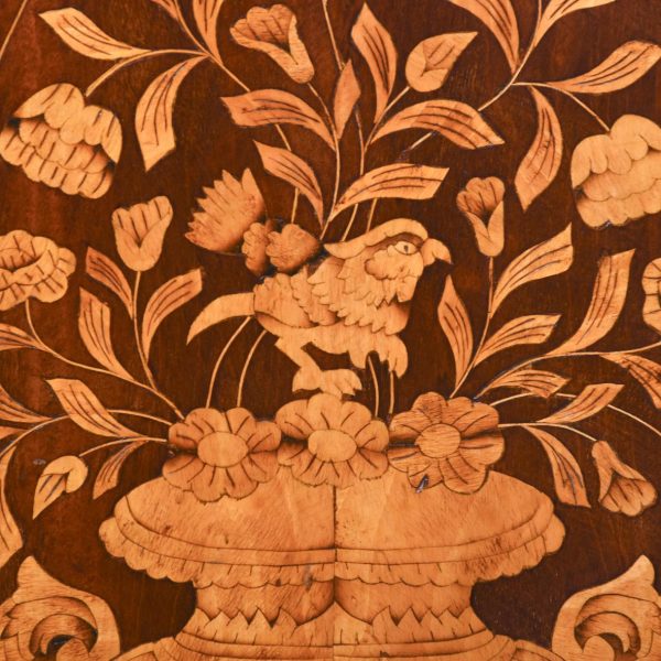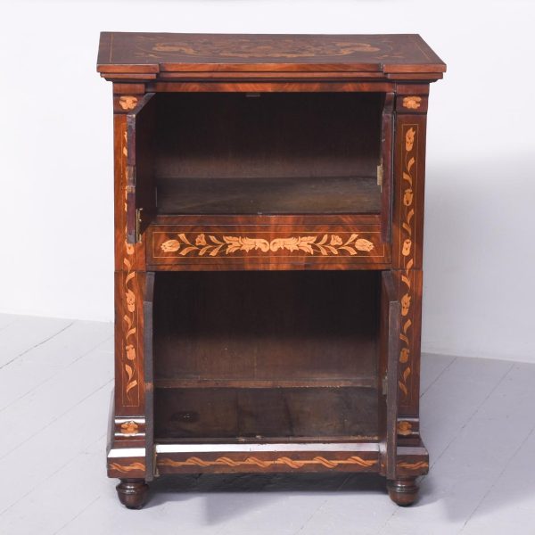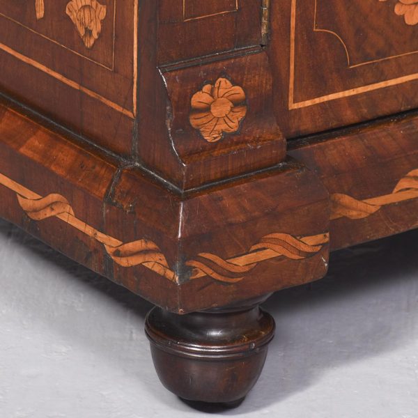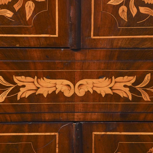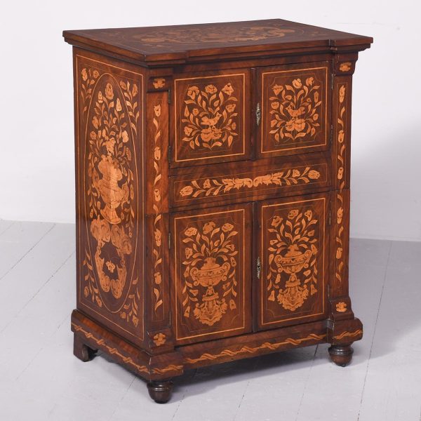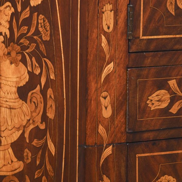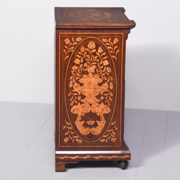 Circa 1840. A quality Dutch marquetry inlaid mahogany cabinet of desirable proportions. The top is profusely inlaid with urn and foliate decoration with extensive frieze inlay above a two-door cupboard with further marquetry. The sides with extensive marquetry inlay and supported on neat turned feet in front and shaped rear bracket feet.