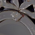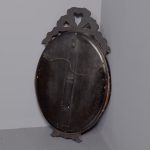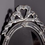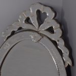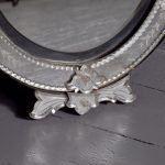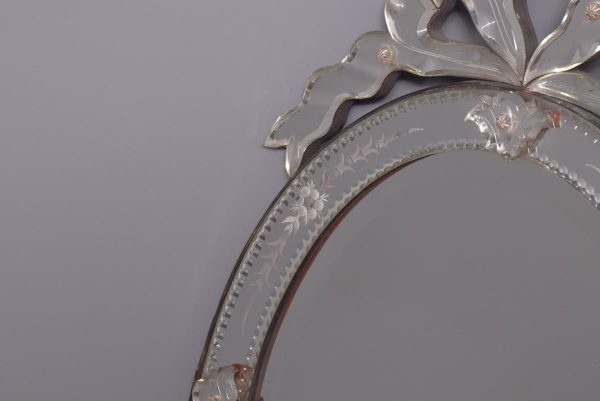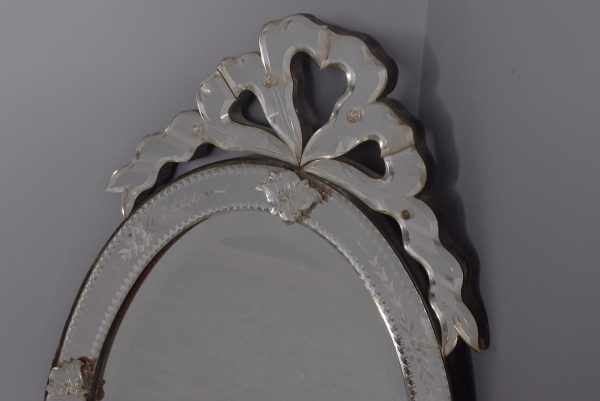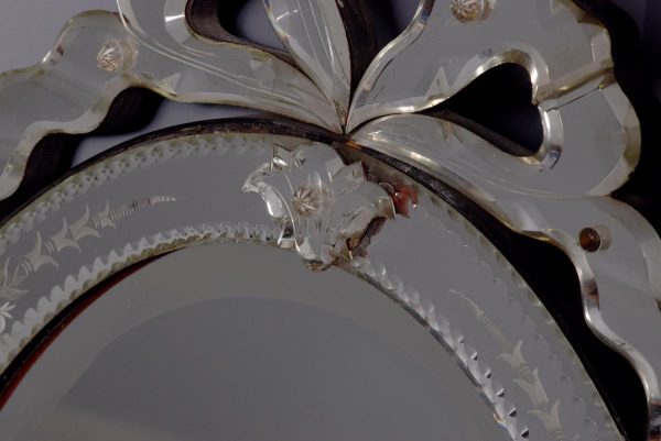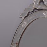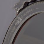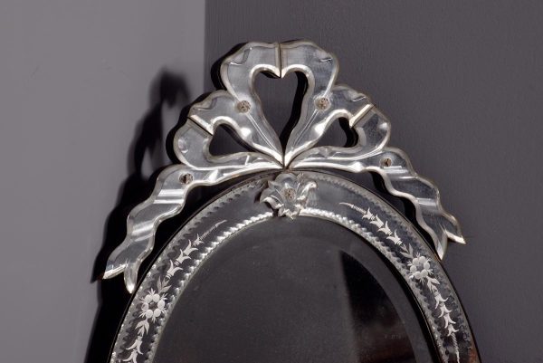 Circa 1870. Quality Venetian cut glass wall mirror of oval form surmounted by an open pediment in a ribbon bow shape and with a similar pendant decoration to the base and with an engraved secondary mirror rim with applied foliate decorations. With original ebonised back containing a folding stand.