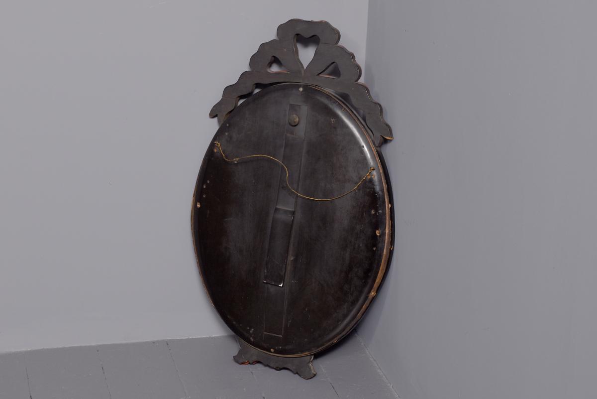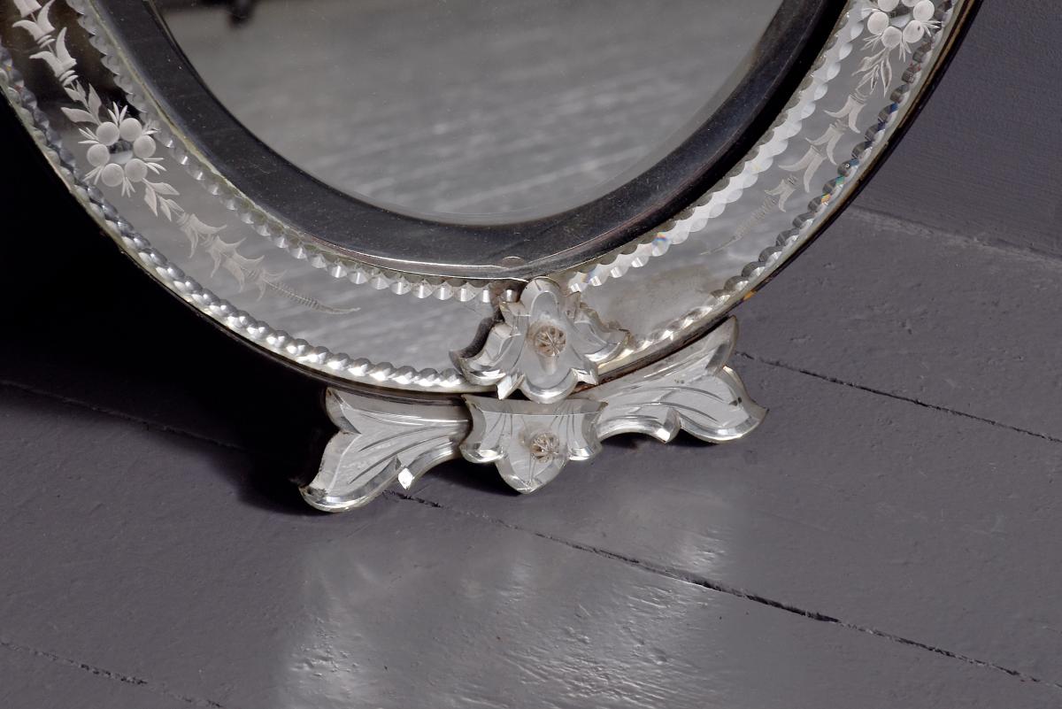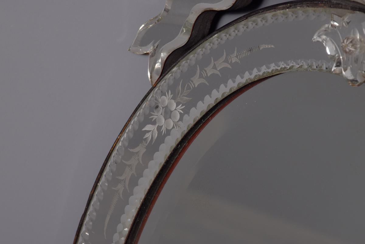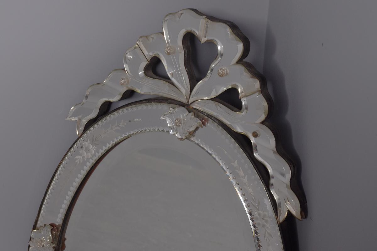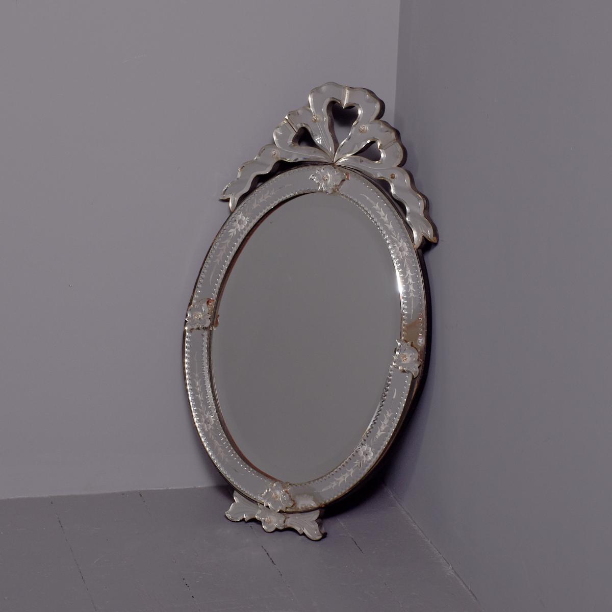 Circa 1870. Quality Venetian cut glass wall mirror of oval form surmounted by an open pediment in a ribbon bow shape and with a similar pendant decoration to the base and with an engraved secondary mirror rim with applied foliate decorations. With original ebonised back containing a folding stand.