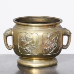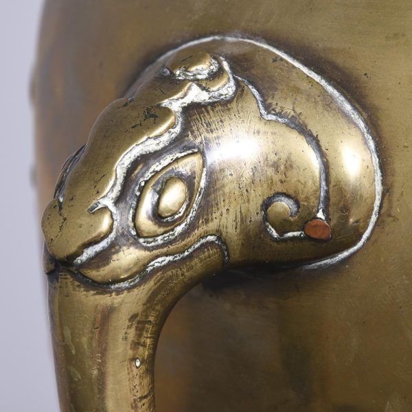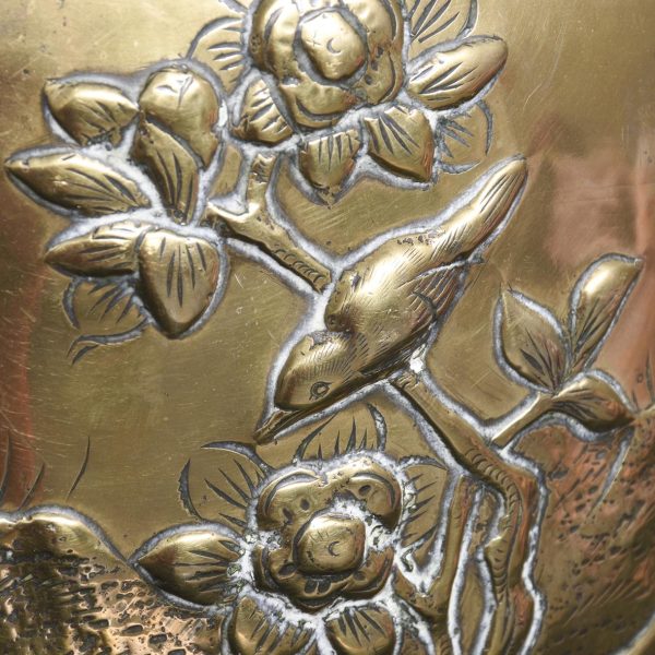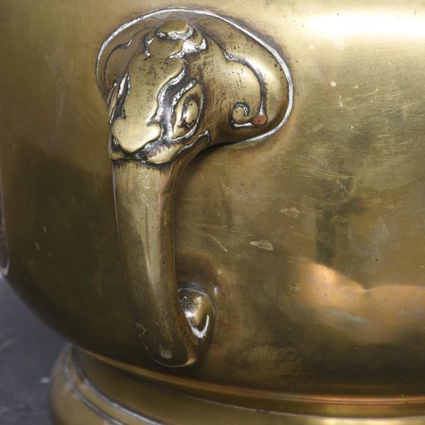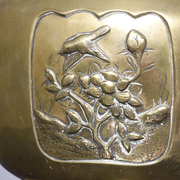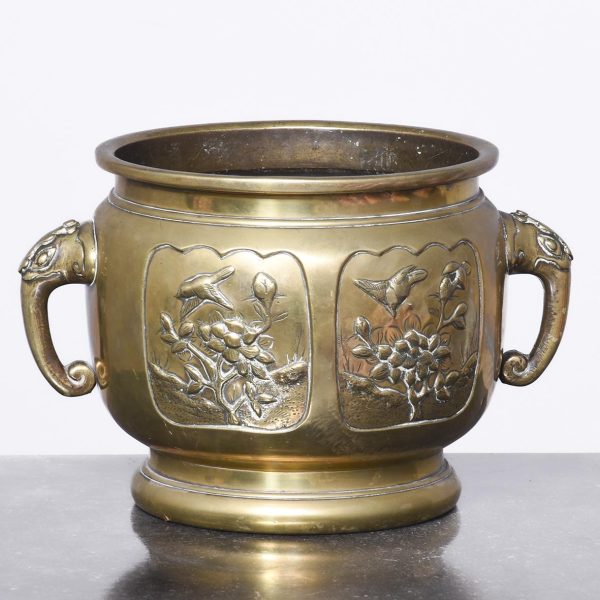 Circa 1890. Quality cast brass Qing period Chinese jardinière. The circular rim above the sides with four panels with cast bird and foliate decorations, and two handles in the form of elephant trunks and all on a circular base.