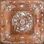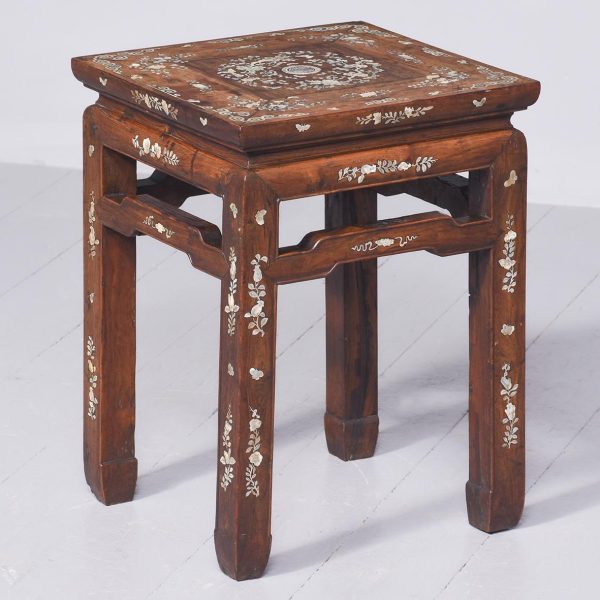 Circa 1880. Quality, Chinese Qing period mother of pearl inlaid occasional table. The square top with a floating central panel with an inlaid Chinese motif surrounded by extensive floral mother of pearl inlay, over a convex inlaid frieze and shaped classical Chinese stretchers. Supported on square inlay supports. In excellent condition.