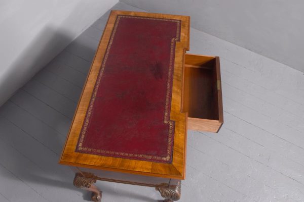 Circa 1920. Quality Chippendale style freestanding burr walnut writing desk. The top with a gilt-tooled burgundy leather writing surface, walnut cross branding and moulded edges over three frieze drawers with brass swan-neck handles and mirror-matched burr walnut fronts, brass locks and solid mahogany linings (sign of quality). With polished sides and back and supported on cabriole legs with acanthus carved knees and ball and claw feet. Lovely colour and patina