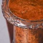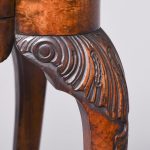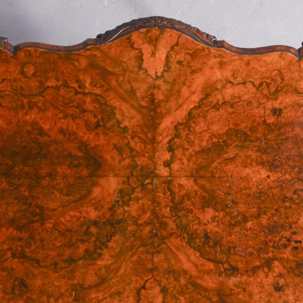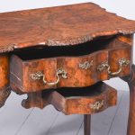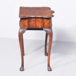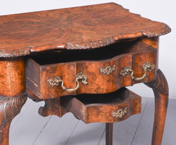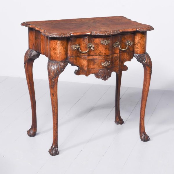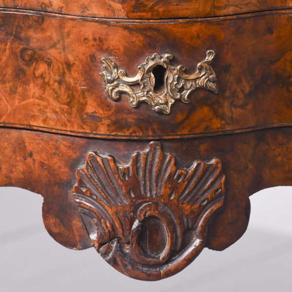 Circa 1820. Quality Dutch burr-walnut lowboy. The shaped and carved top with quarter matching rich burr walnut veneers. The fore edge with foliate carving in various sections, the shaped frieze with one full drawer with a smaller drawer beneath, each with elegant escutcheon and a pair of