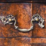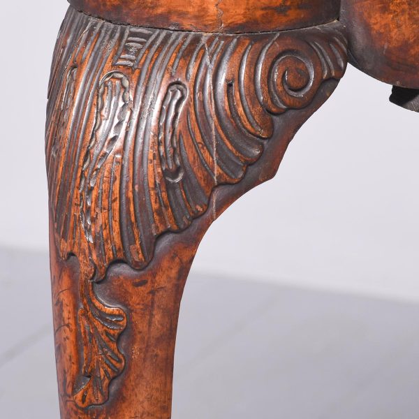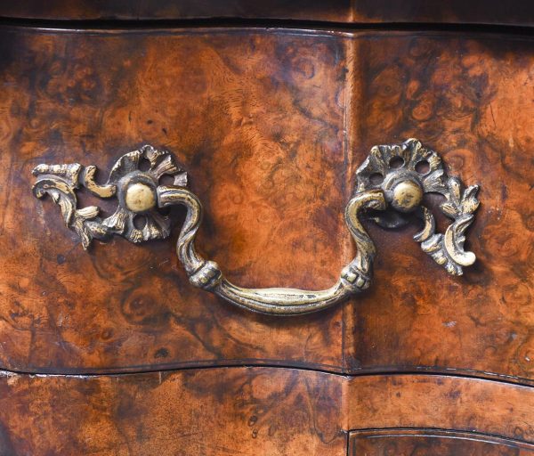 Rococo cast brass swan neck handles with elegant back plates, the fore edges are rounded with serpentine sides, and a well-shaped frieze to the front with further foliate carving, all resting on four elegant cabriole legs with foliate carving on the knees and quarter blocks finishing with a ball and claw foot.