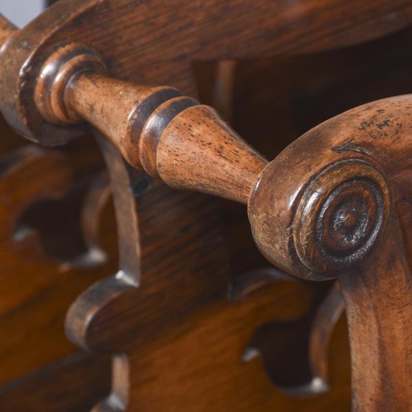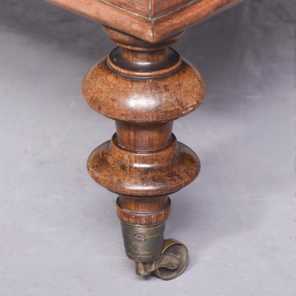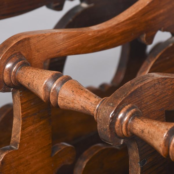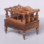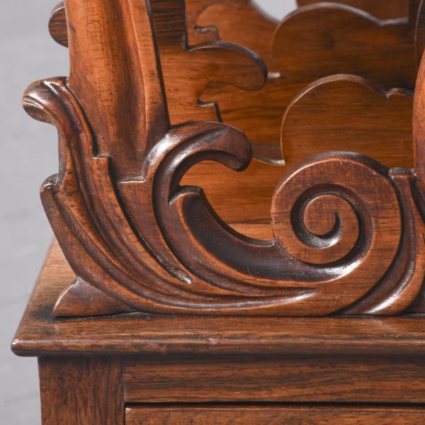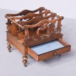 Circa 1850. Quality early Victorian rosewood canterbury. The three music sections divided by curved open foliate carved plates with connecting ring turnings. The base with a drawer with original turned knob and mahogany drawer linings (sign of quality). All supported on short ring turned feet with original brass caps and castors. A stylish magazine rack!