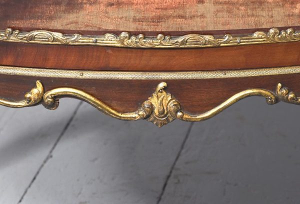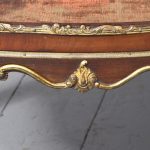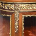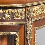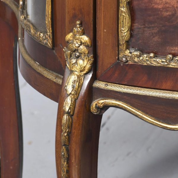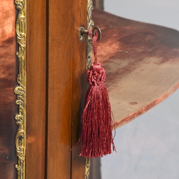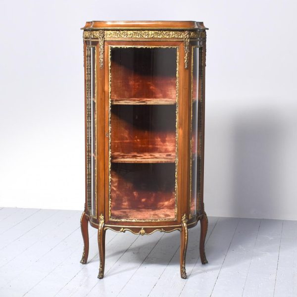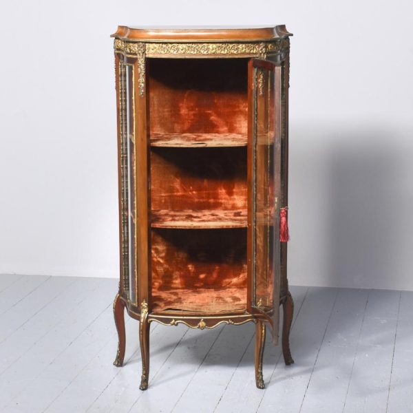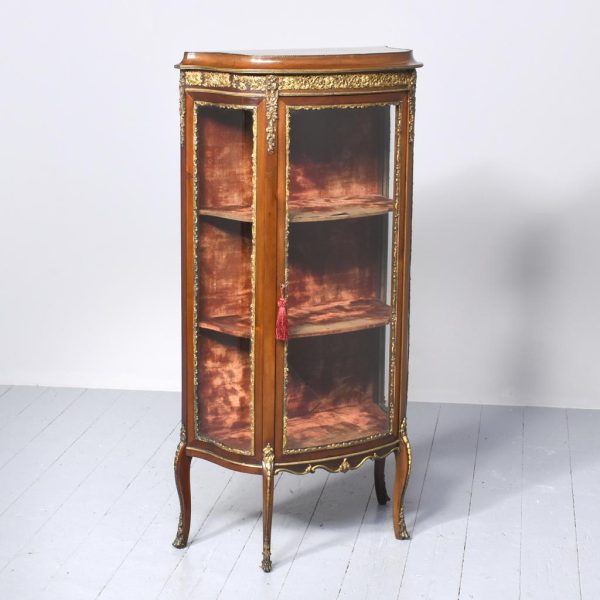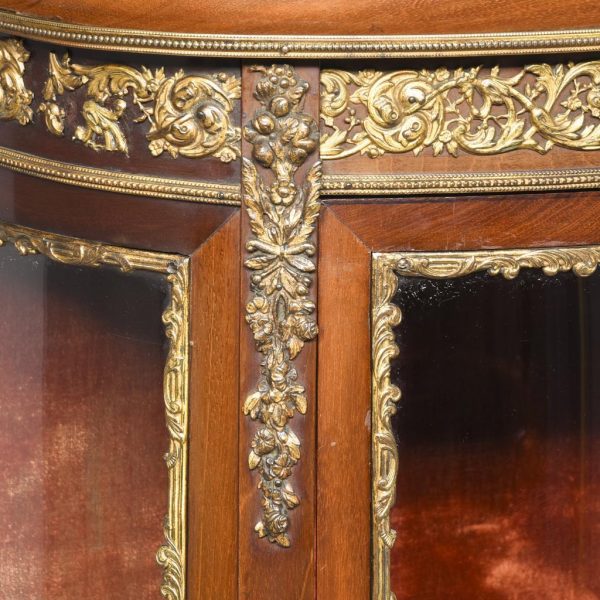 Circa 1860. Quality French, ormolu-mounted mahogany display cabinet. The shaped top in figured Spanish mahogany with a rope-twist brass edge above a cavetto, moulded cornice and further beaded ormolu mouldings. The frieze with superb quality foliate ormolu mouldings above a bow front glazed door opening to a shelved interior flanked by pilasters with further foliate mounts. The sides with serpentine-shaped glazing. All over a shaped skirt with ormolu mounts and cabriole legs with sabots.