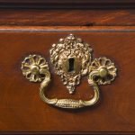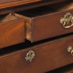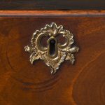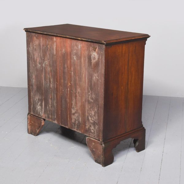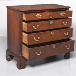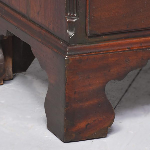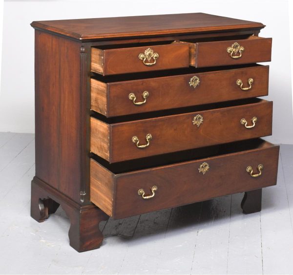 Circa 1780. Quality George III mahogany chest of drawers with canted fluted corners. The rectangular top in a nicely coloured figured Spanish mahogany with a moulded fore-edge, above two short and three long graduated drawers with decorative gilded brass handles and escutcheons, and back to front drawer liners in quarter cut oak. All supported on a moulded base and original shaped bracket feet.